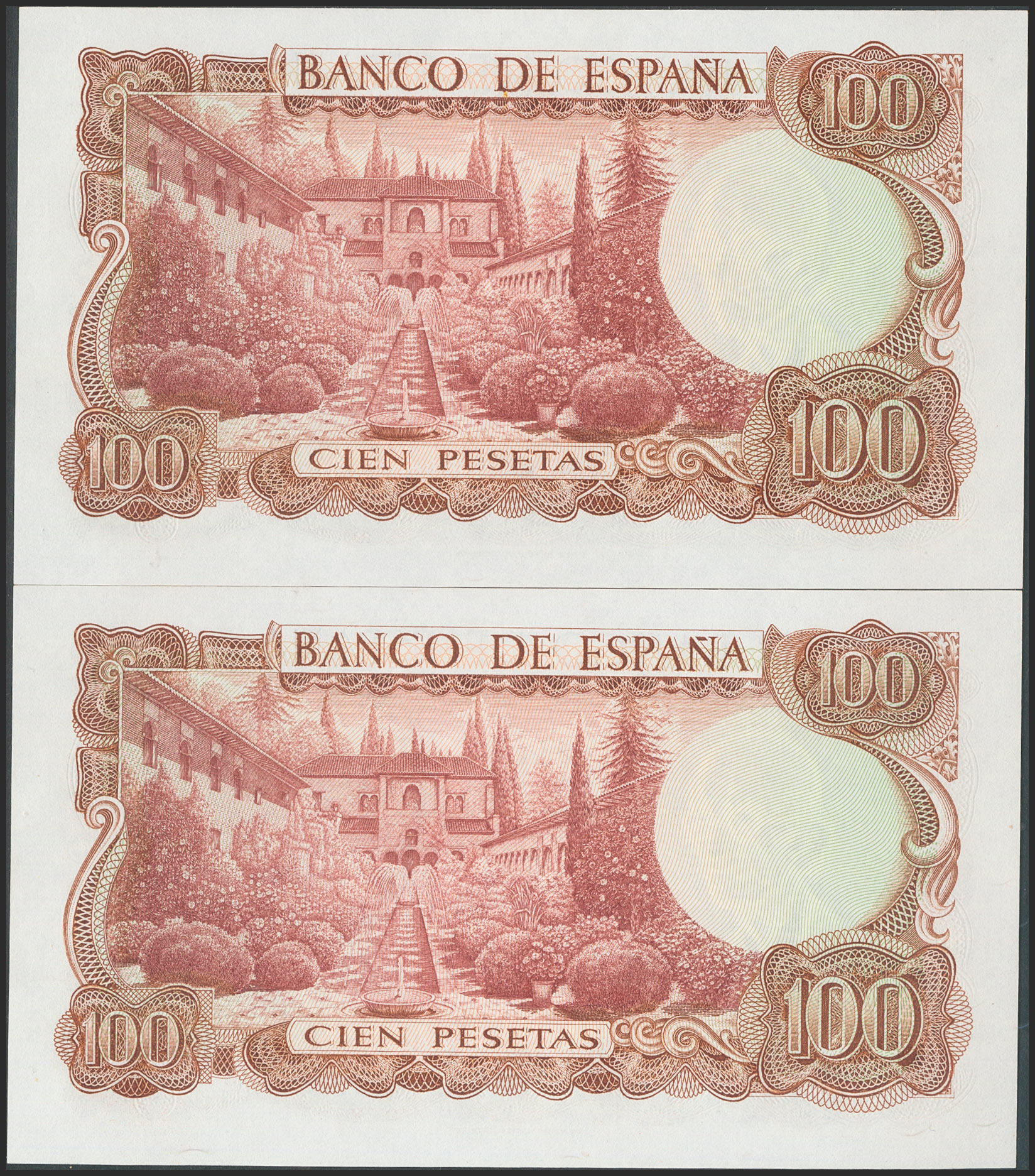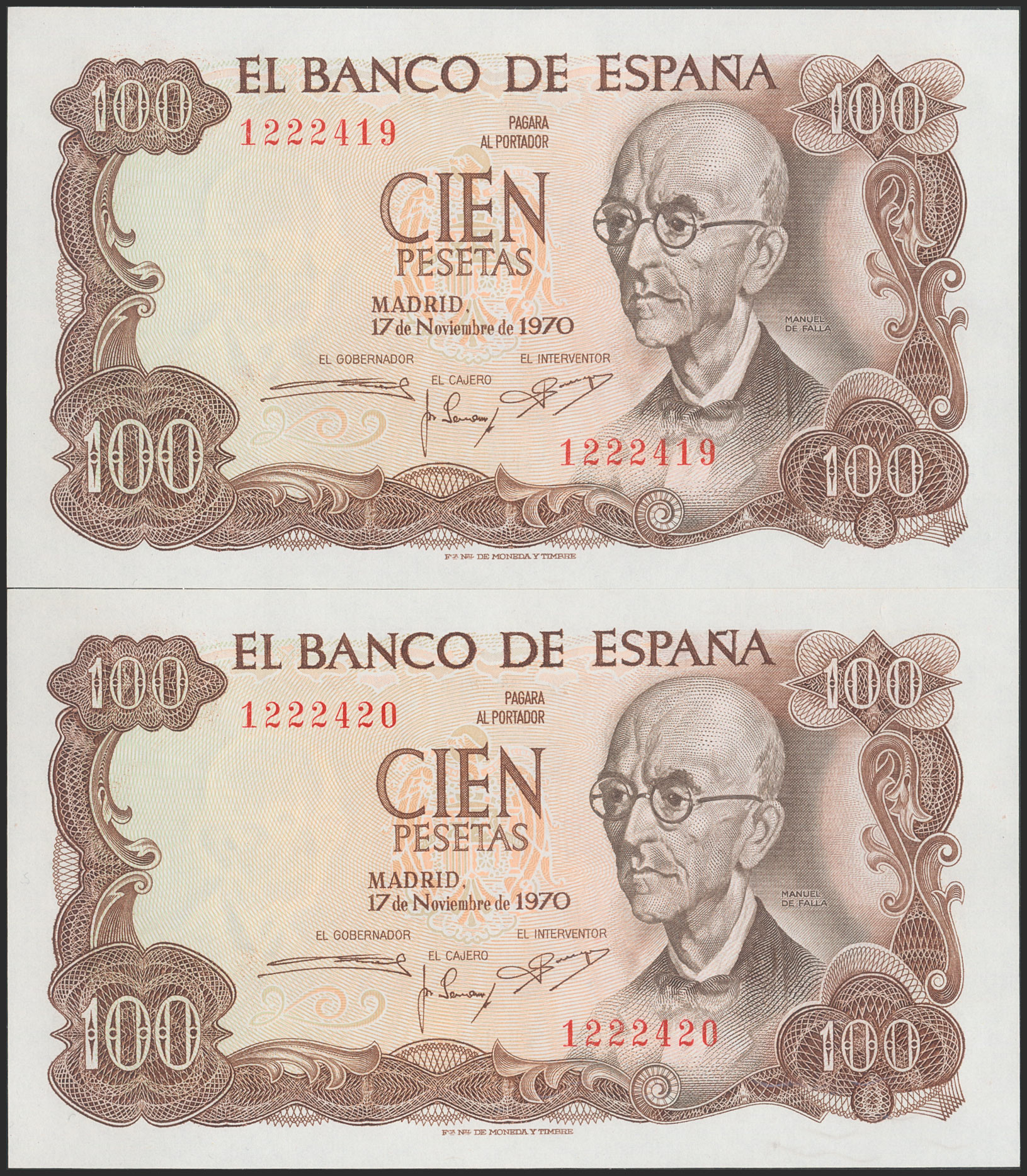 100 Pesetas. 17 de Noviembre de 1970. Pareja correlativa. Sin serie. (Edifil 2017: 472). Apresto original. SC.