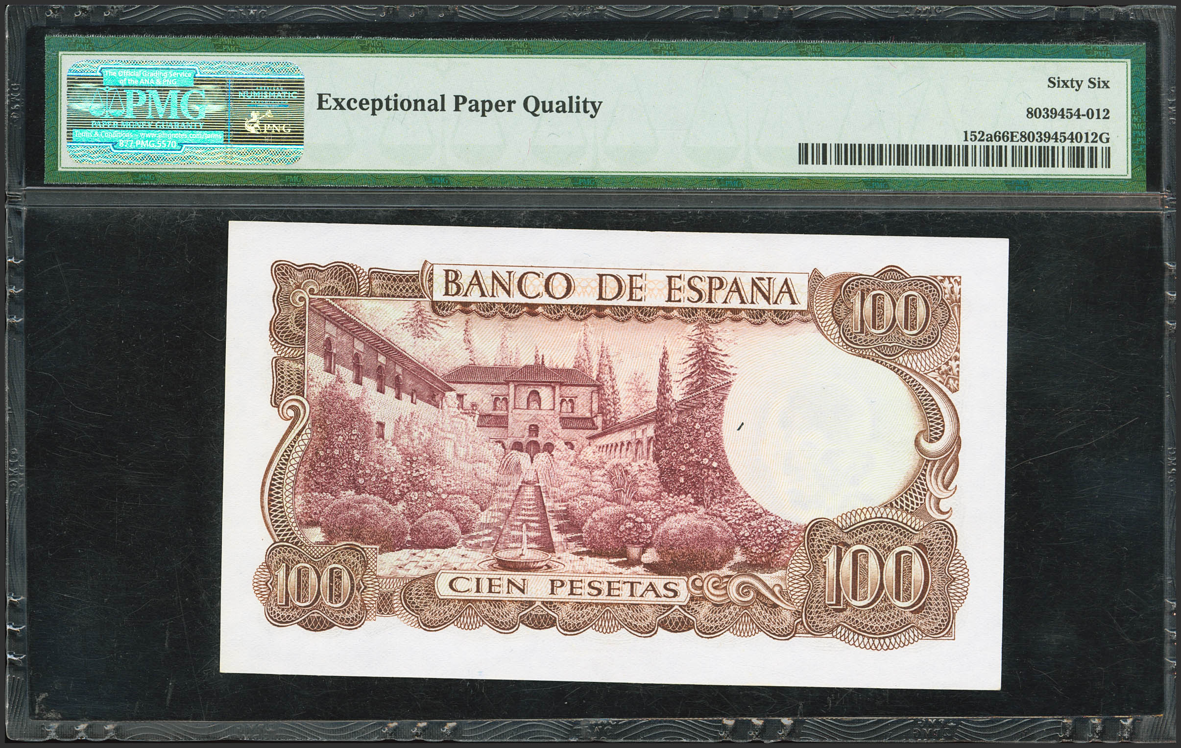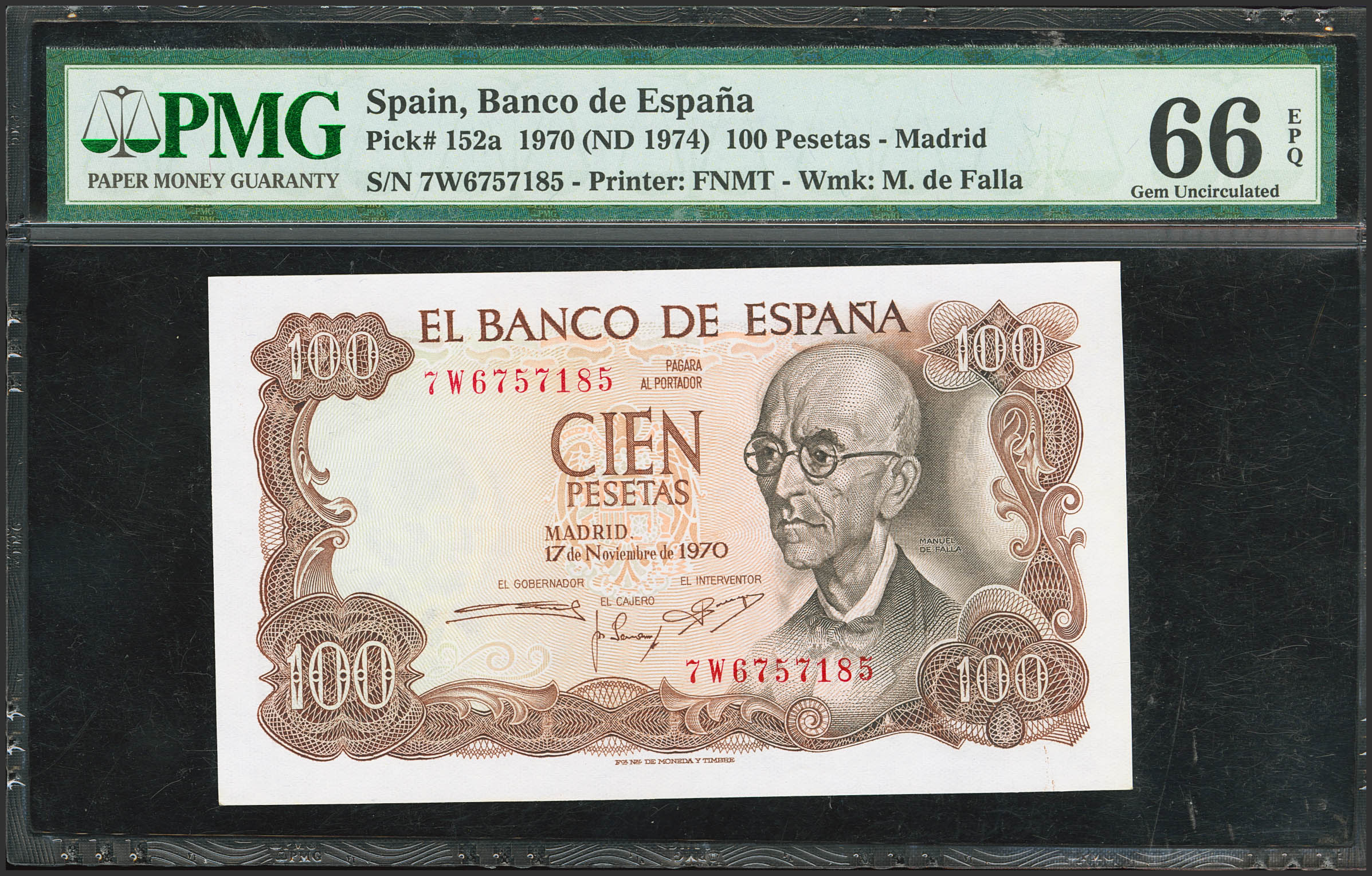 100 Pesetas. 17 de Noviembre de 1970. Serie 7W, última serie emitida. (Edifil 2023: 472c, Pick: 152a). Apresto original. SC. Encapsulado PMG66EPQ.