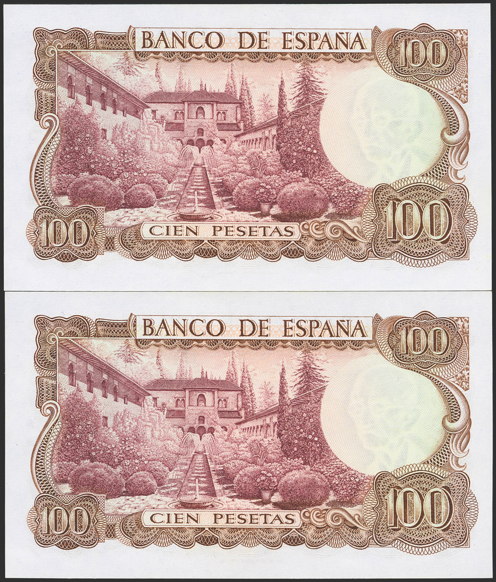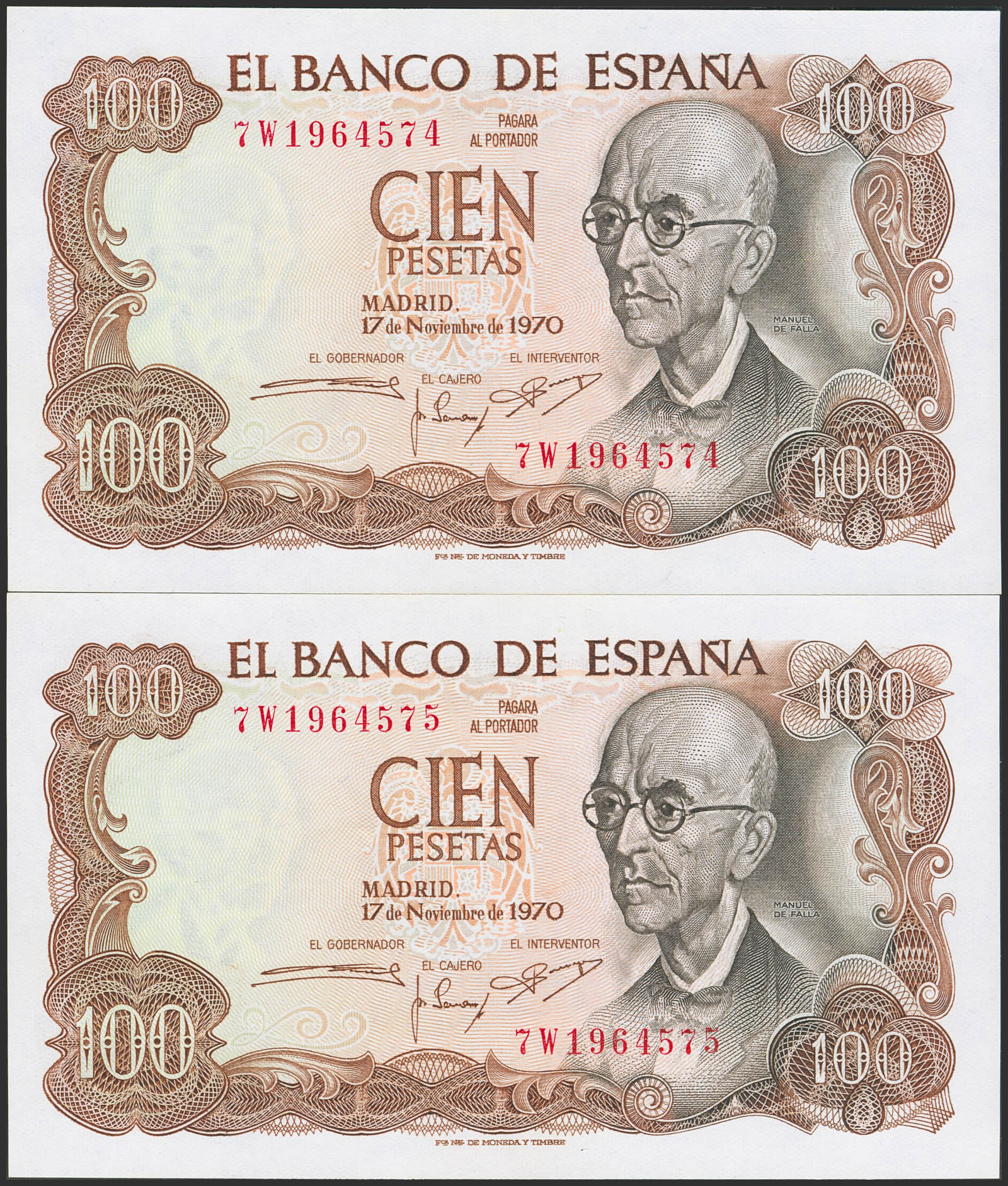 100 Pesetas. 17 de Noviembre de 1970. Pareja correlativa. Serie 7W, última serie emitida. (Edifil 2023: 472c). Apresto original. SC.