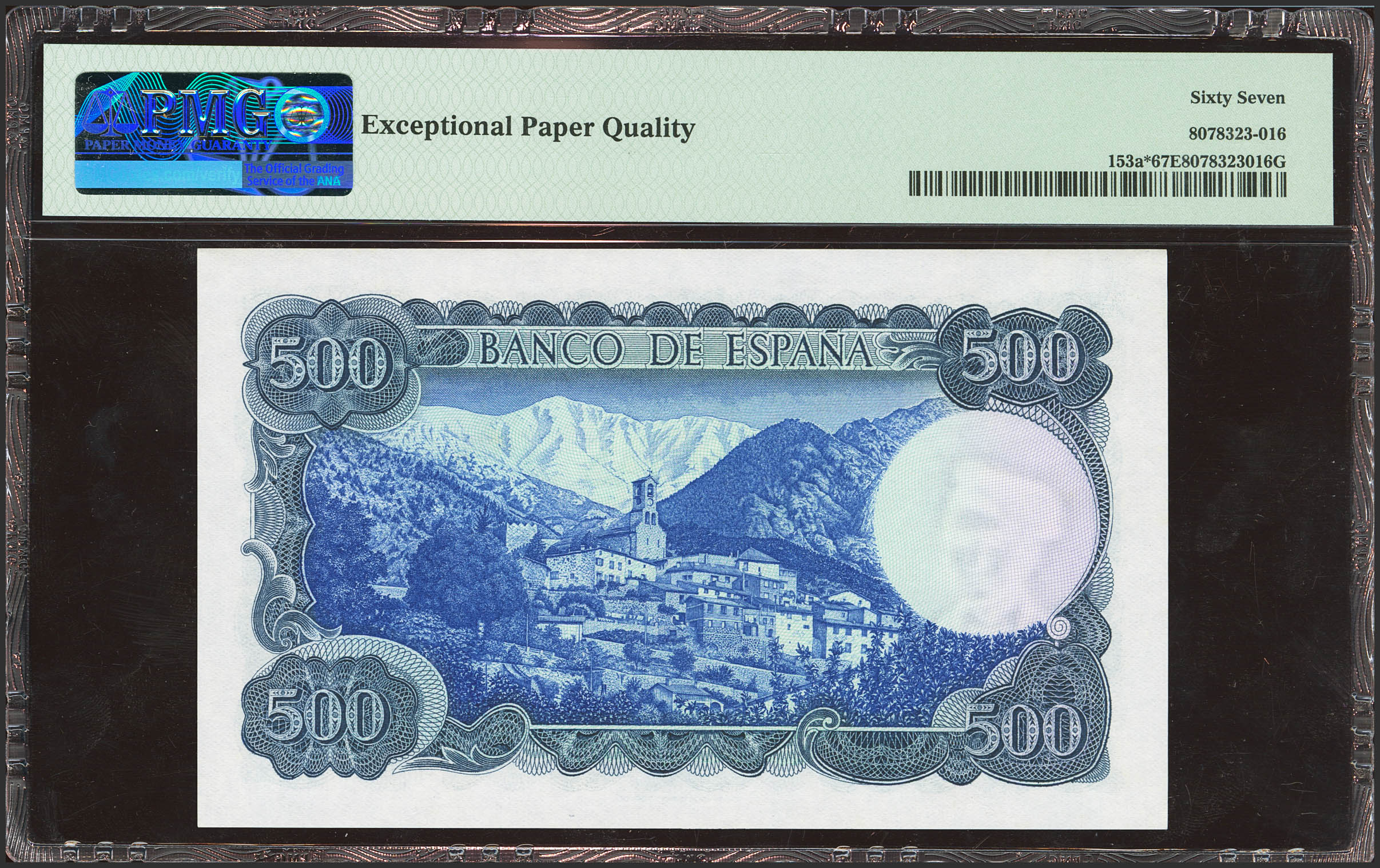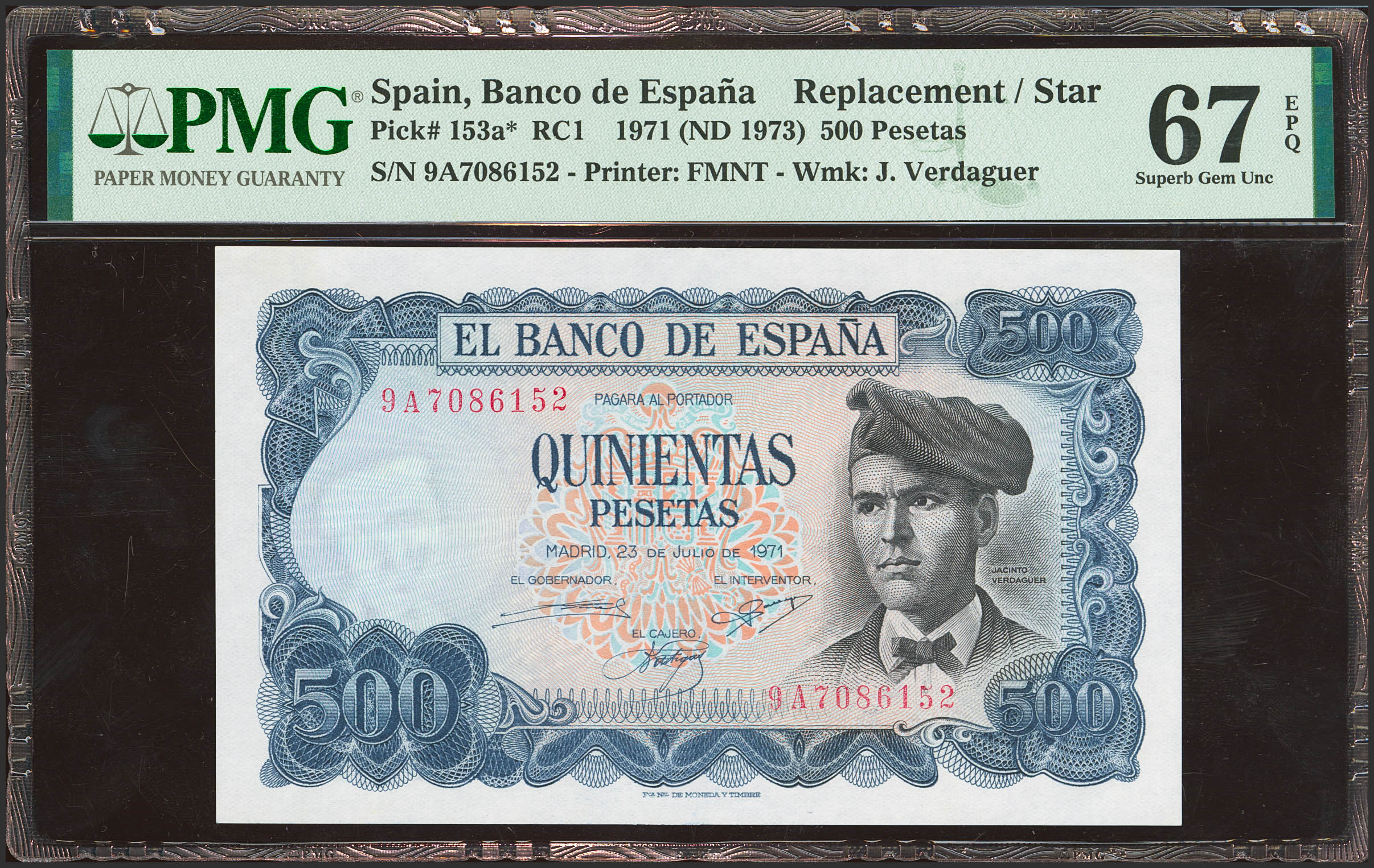 500 Pesetas. 23 de Julio de 1971. Serie especial 9A. (Edifil 2023: 473b, Pick: 153*). Apresto original. SC. Encapsulado PMG67EPQ.