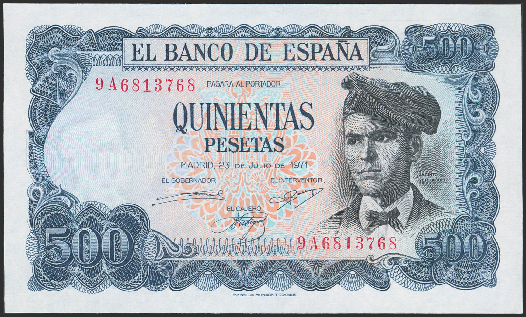 500 Pesetas. 23 de Julio de 1971. Serie especial 9A. (Edifil 2023: 473b). Apresto original. SC.
