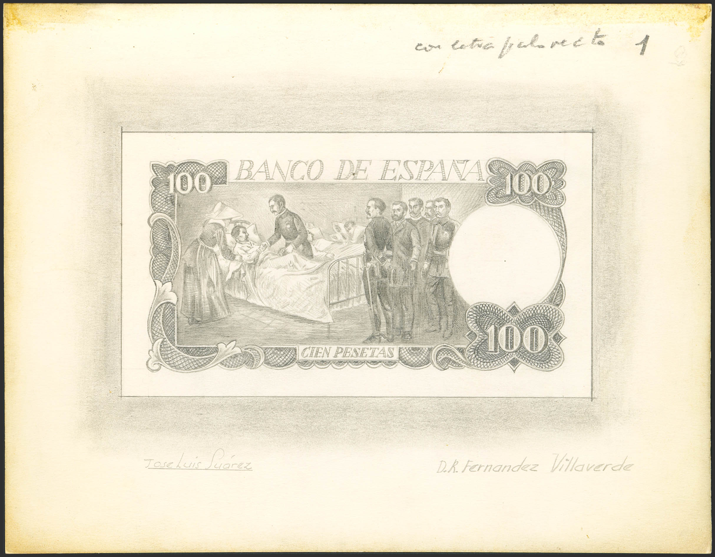 (1974ca). Boceto realizado por Jose Luis Suárez sobre lámina de cartón y a lápiz del reverso de un billete de 100 Pesetas dedicado a Don Raimundo Fernández Villaverde (inscripción en la parte inferior del cartón de presentación) que plasma la visita de un grupo de oficiales a un hospital, probablemente tras las victorias de los libertadores cubanos (el catálogo Edifil especializado del año 2023 ilustra en la página 183 una prueba del anverso, con el mismo arte y con la numeración NE68, dedicada a Don Raimundo Fernández Villaverde; este diseño de reverso se complementa con el catalogado). Espectacular y pieza única.