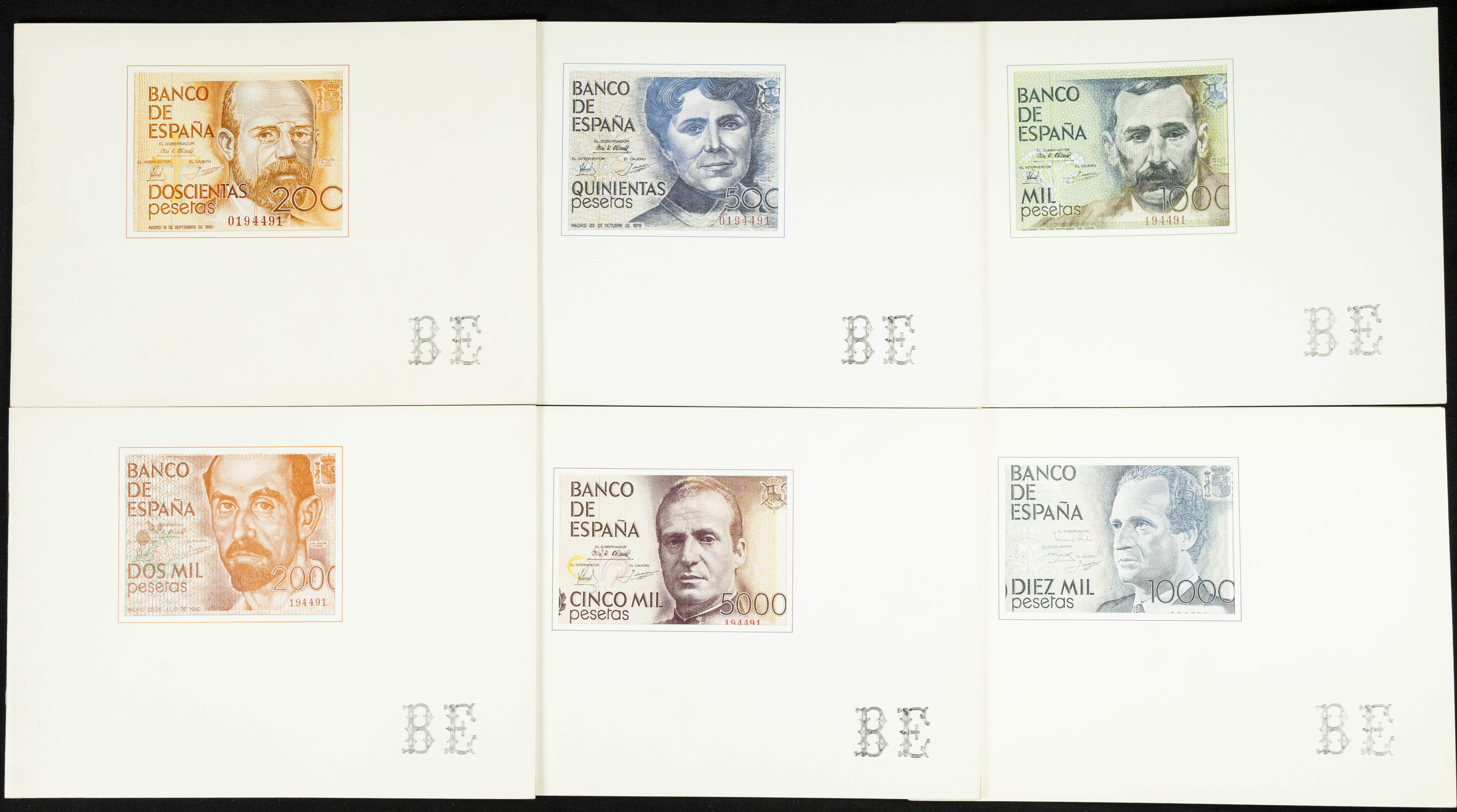 Juego de seis folletos del Banco de España con la presentación del billete y las características de cada uno de los emitidos en el periodo entre 1979 y 1985.