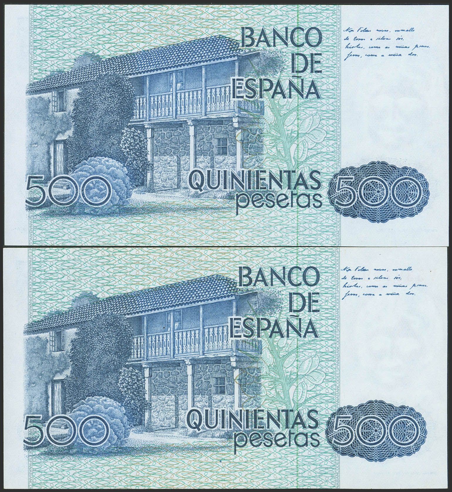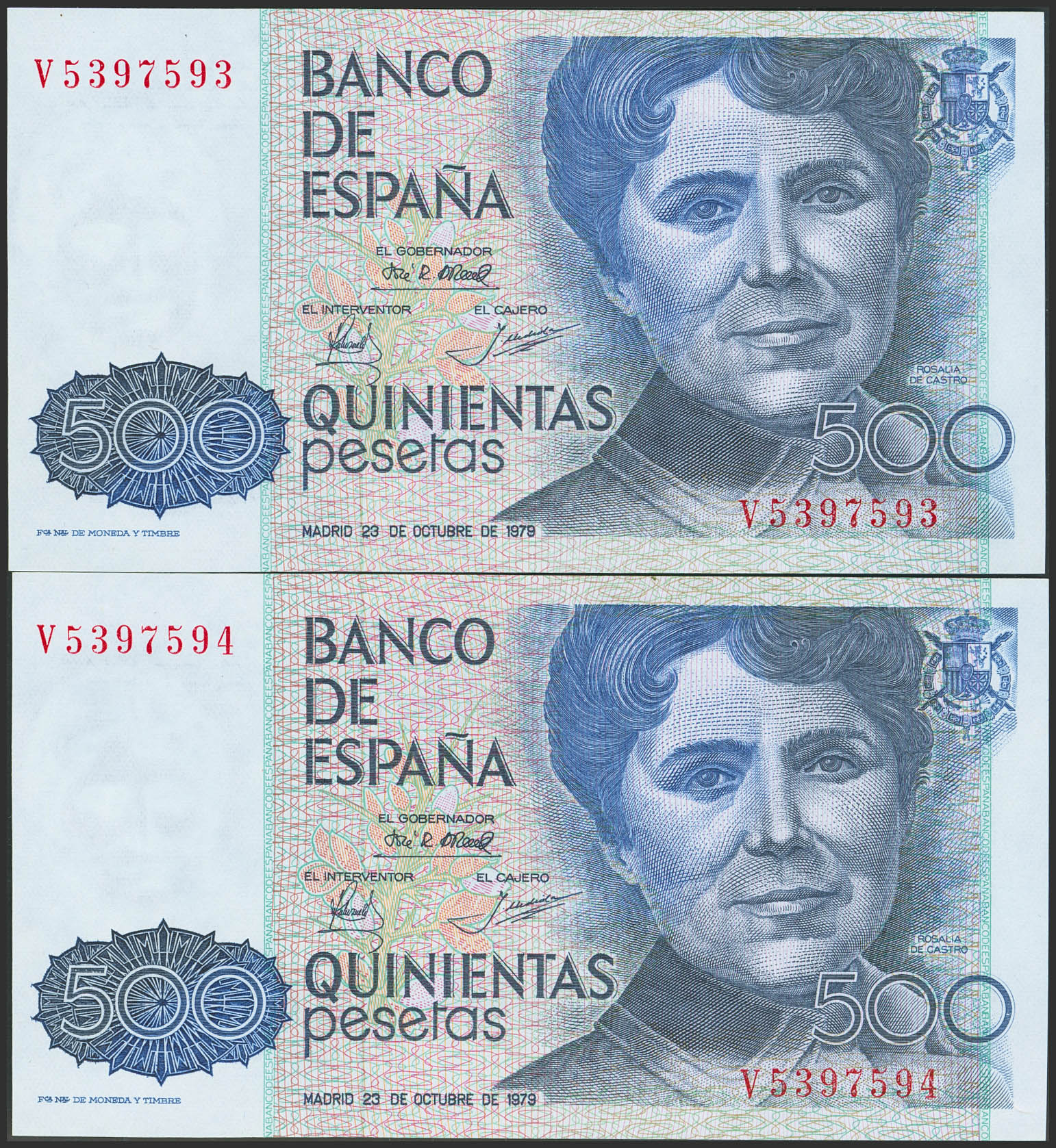 500 Pesetas. 23 de Octubre de 1979. Pareja correlativa. Serie V. (Edifil 2023: 476a). SC.