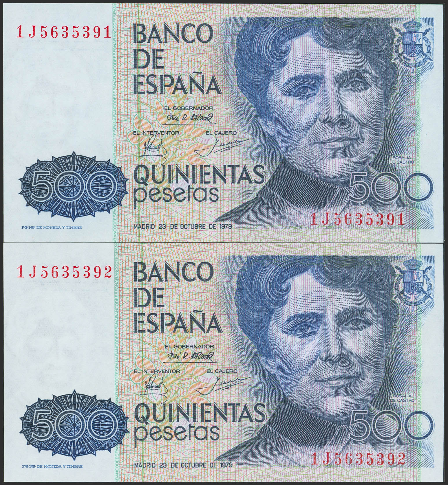 500 Pesetas. 23 de Octubre de 1979. Pareja correlativa. Serie 1J. (Edifil 2023: 476a). SC.