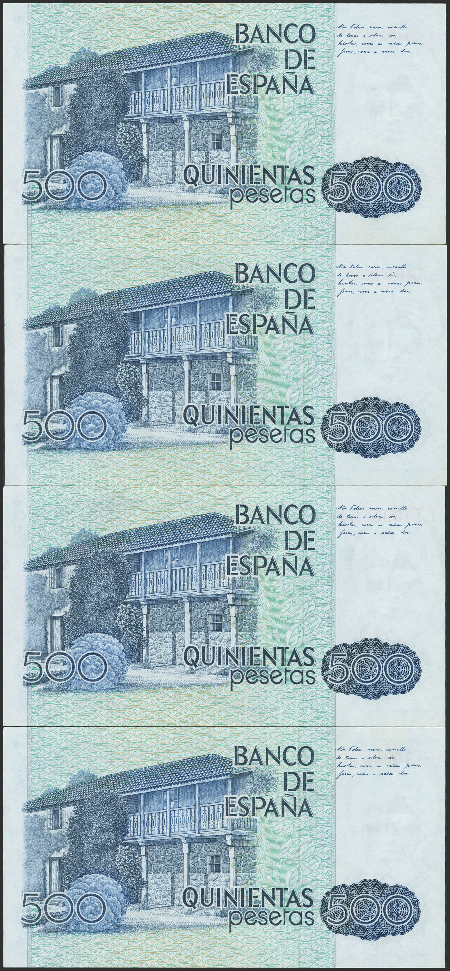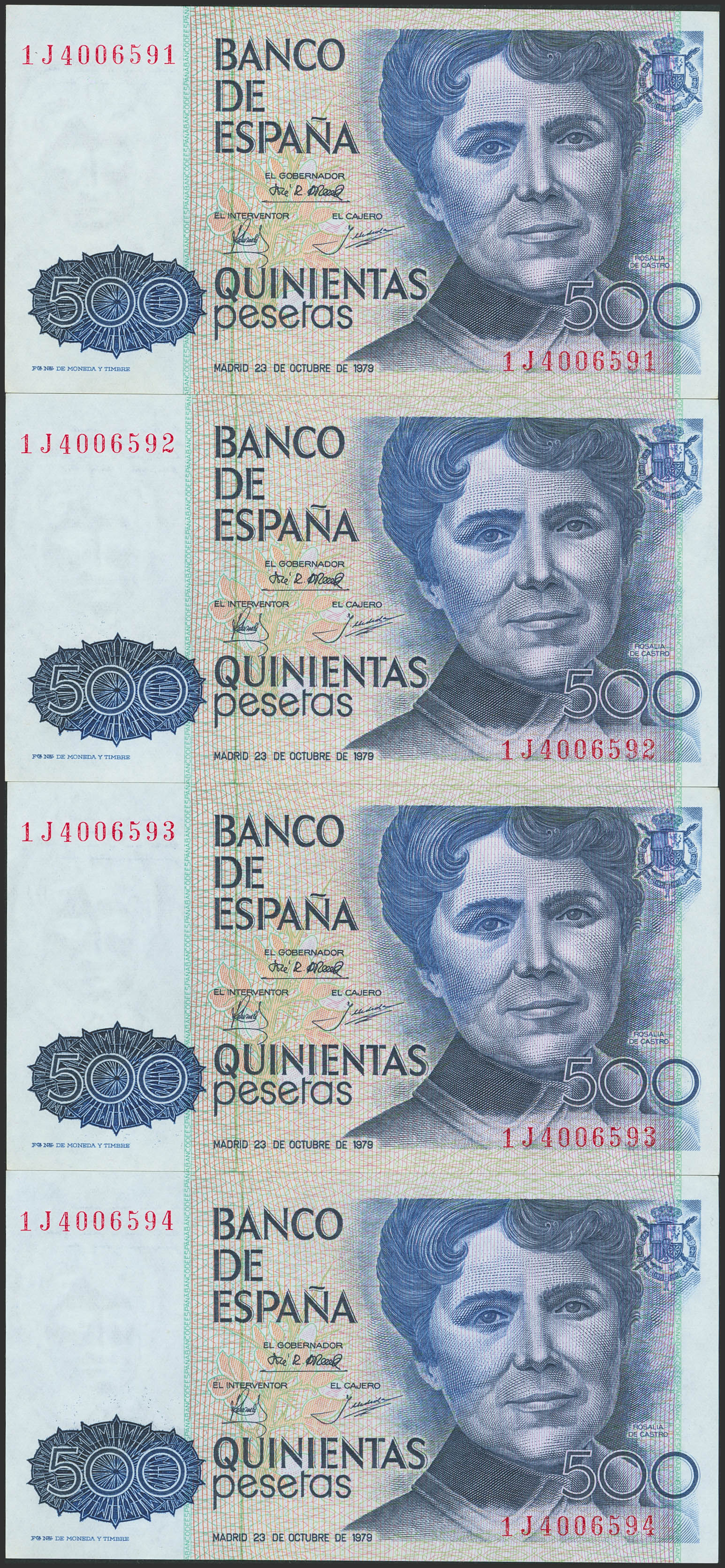 Conjunto de 4 billetes correlativos de 500 Pesetas, emitidos el 23 de Octubre de 1979, todos ellos con la serie 1J, (Edifil 2023: 476a). SC.