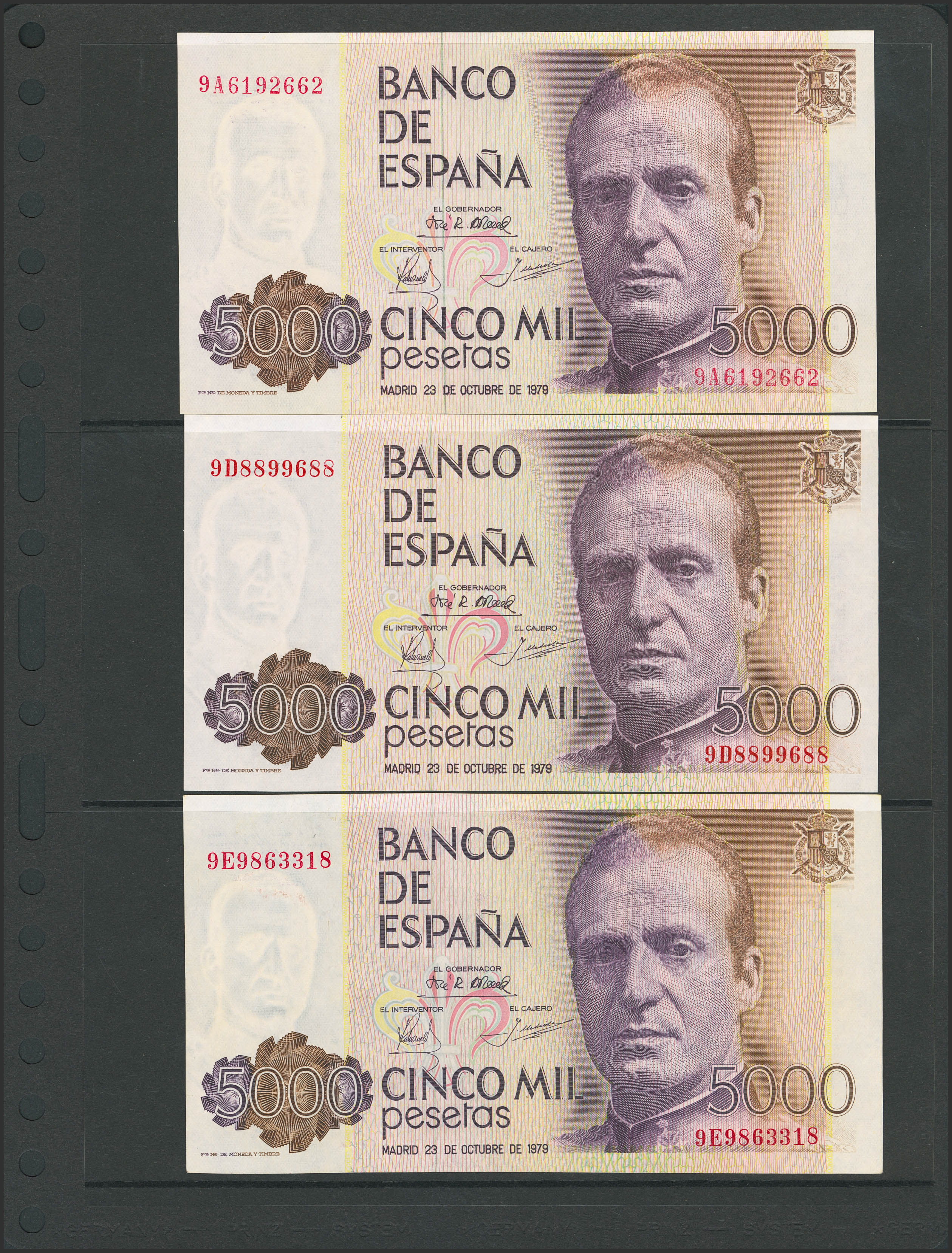 Conjunto de 3 billetes de 5000 Pesetas emitidos el 23 de Octubre de 1979, con las series especiales 9A, 9D y 9E. (Edifil 2023: 478b). EBC+.