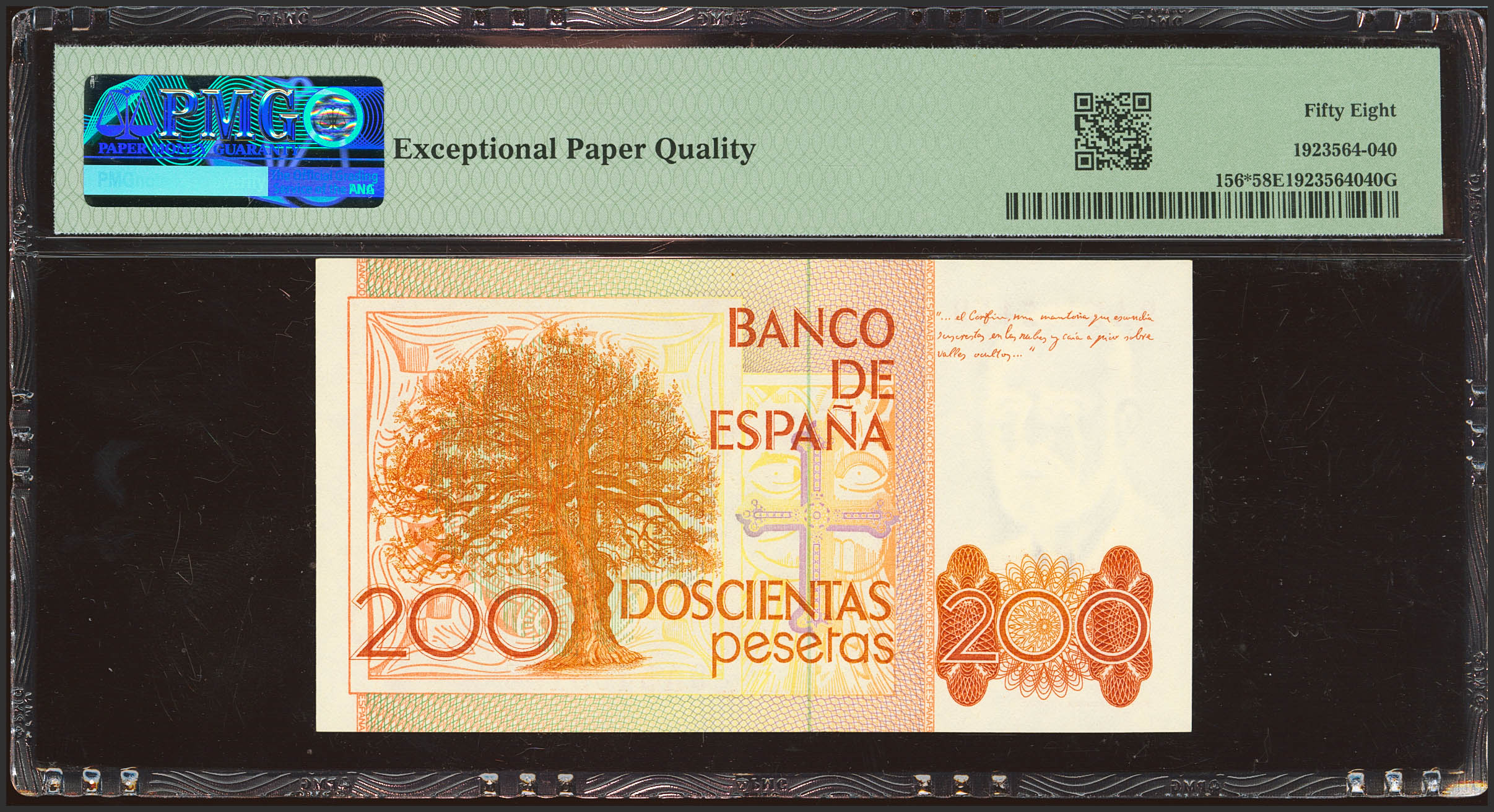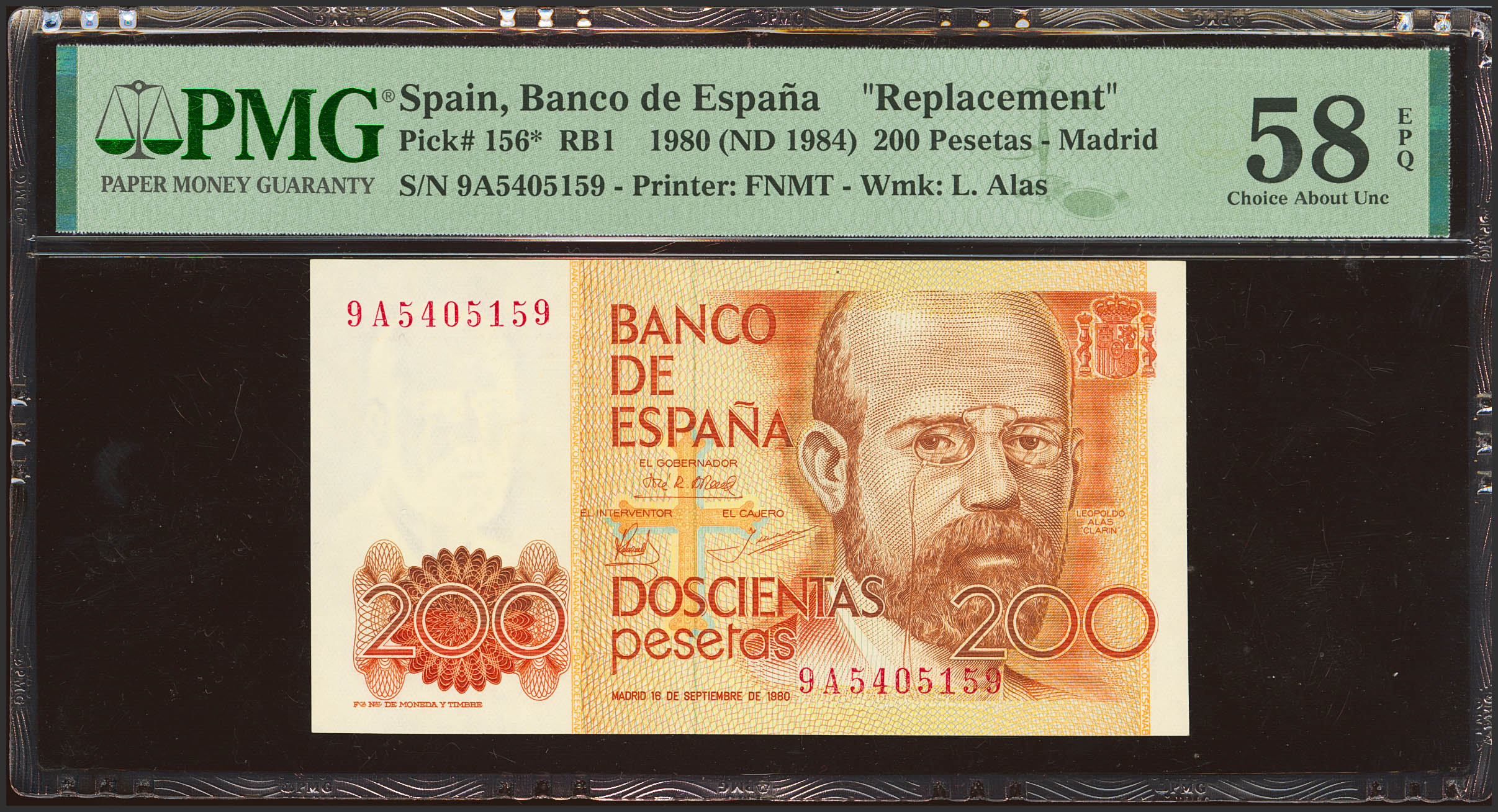 200 Pesetas. 16 de Septiembre de 1980. Serie especial 9A. (Edifil 2023: 480b, Pick: 156*). EBC+++. Encapsulado PMG58EPQ.
