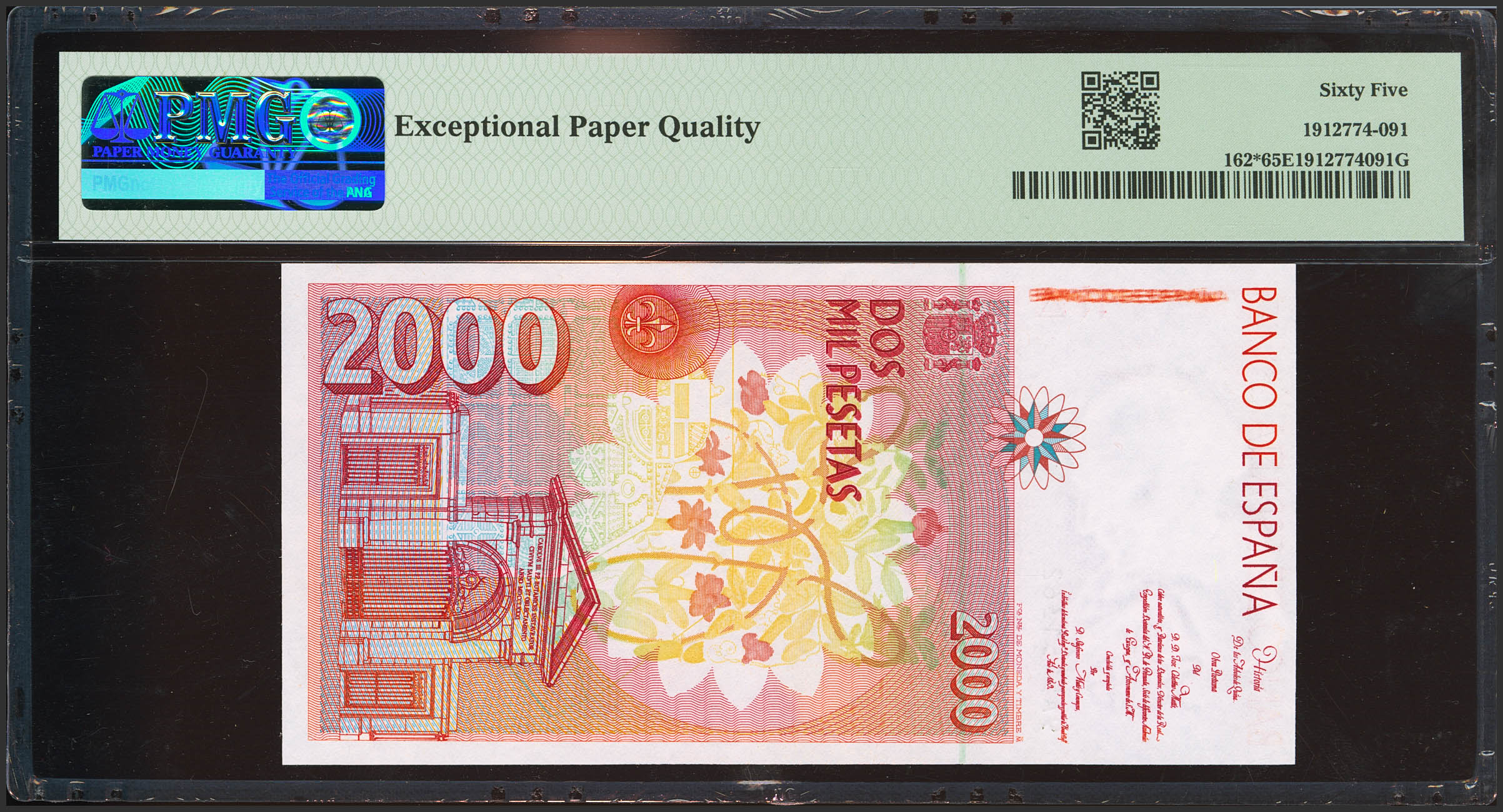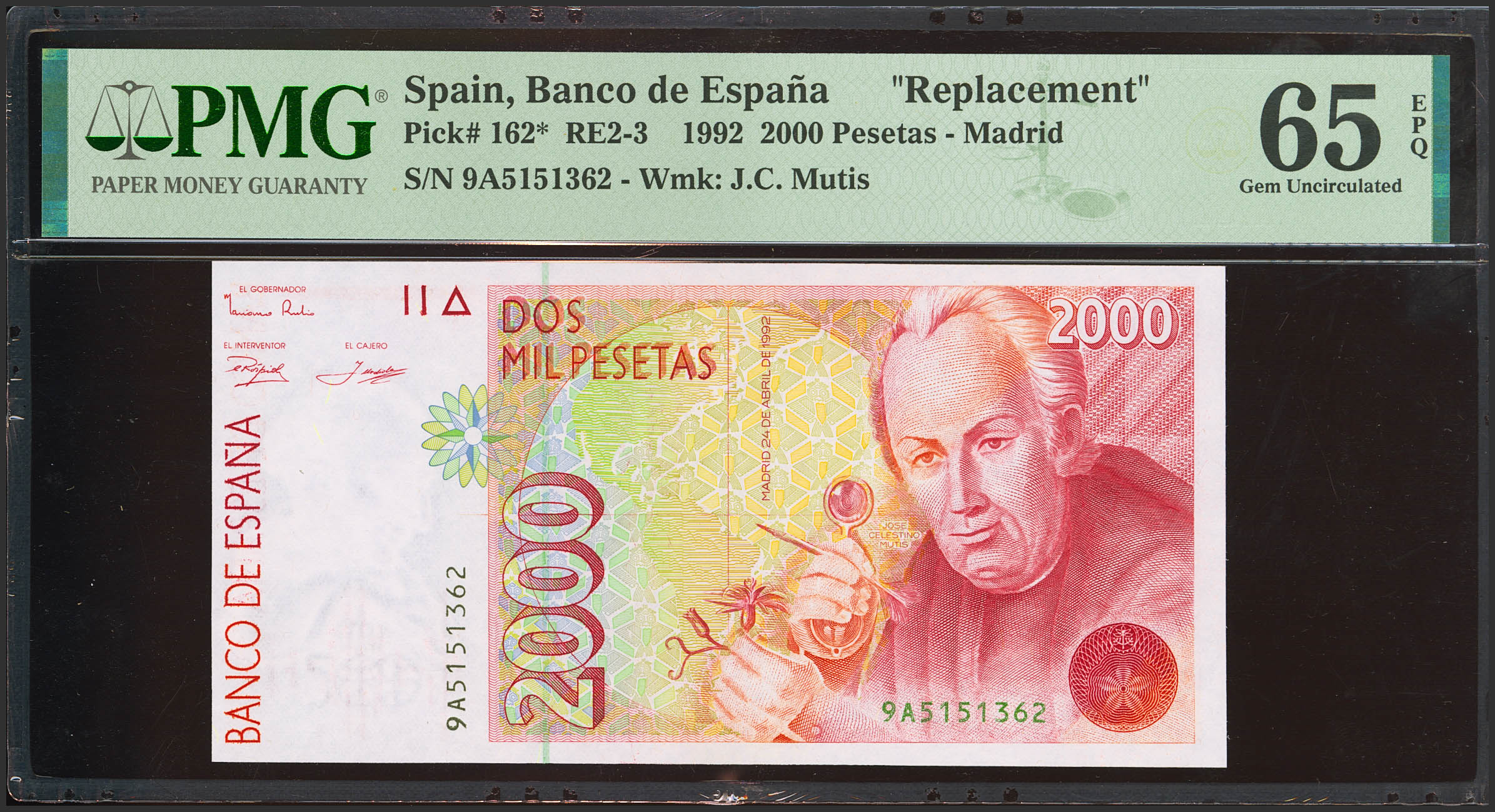 2000 Pesetas. 24 de Abril de 1992. Serie especial 9A. (Edifil 2021: 482b, Pick: 162*). Inusual serie en esta excepcional calidad. SC. Encapsulado PMG65EPQ.