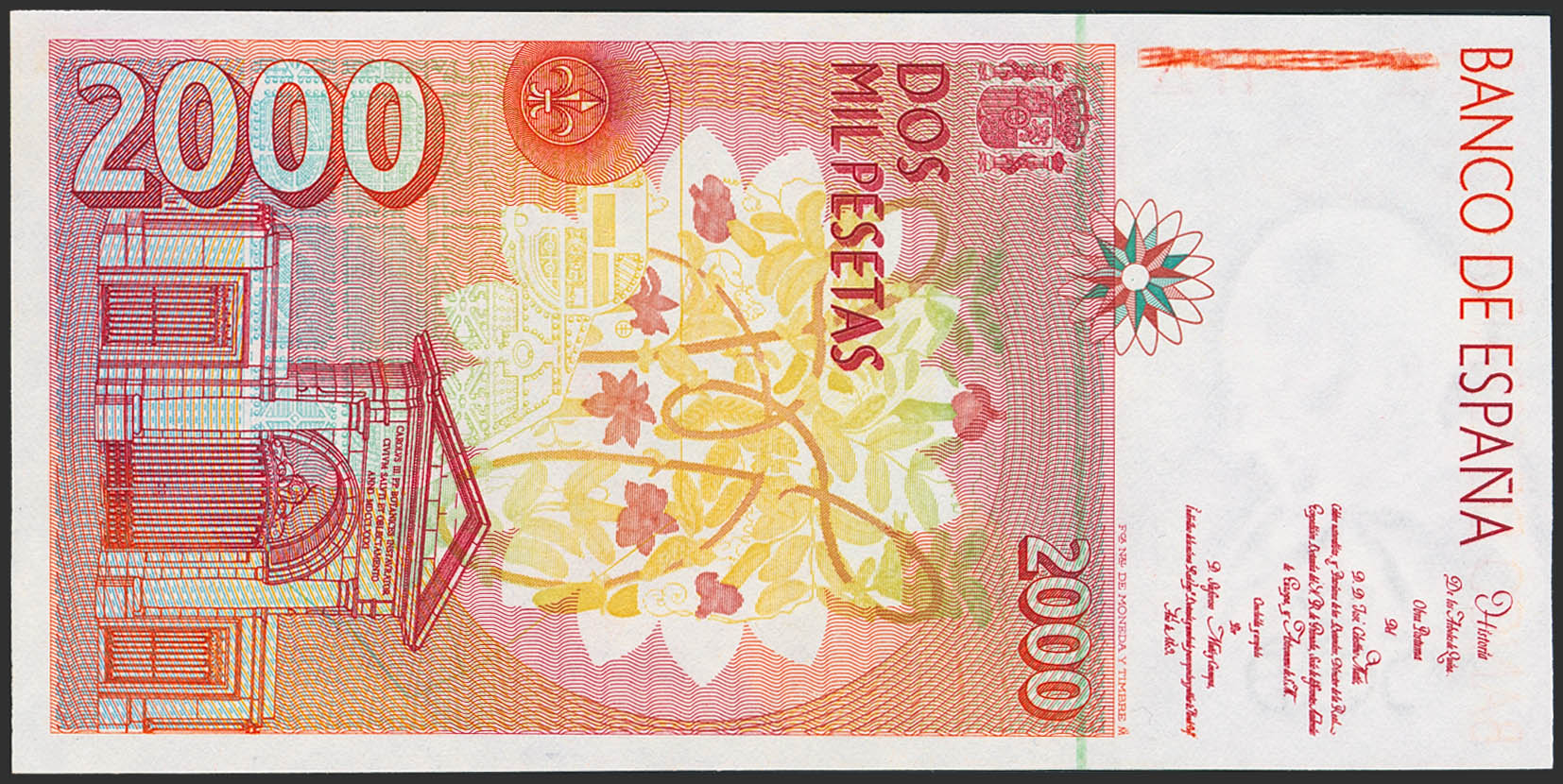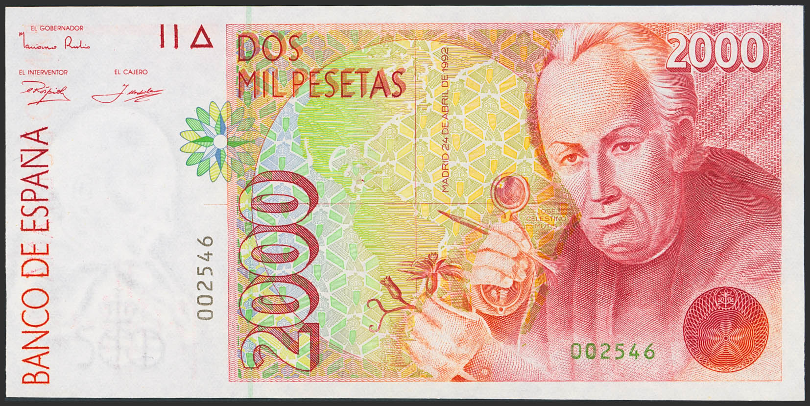 2000 Pesetas. 24 de Abril de 1992. Sin serie y numeración bajísima. (Edifil 2021: 482). SC.