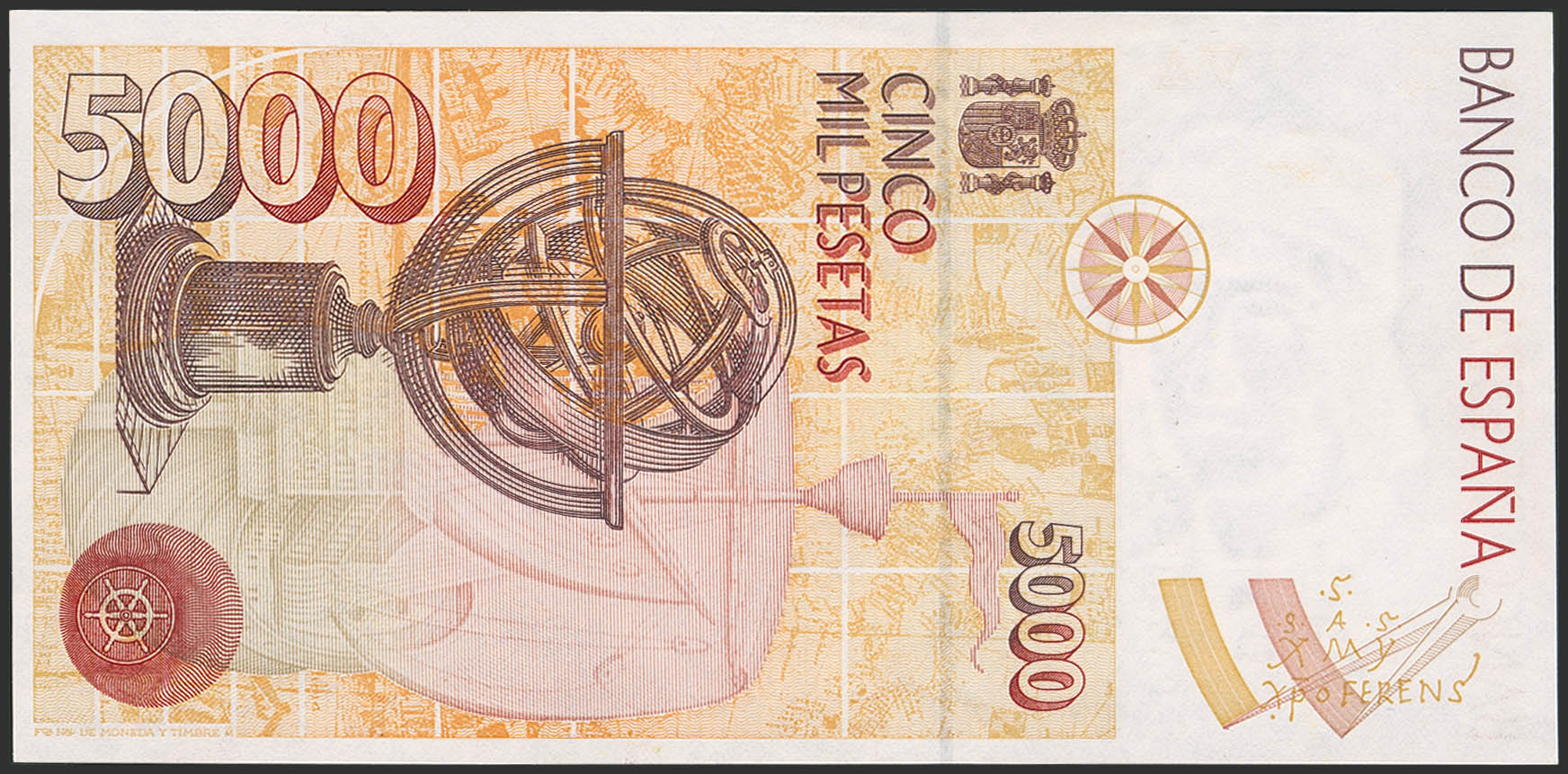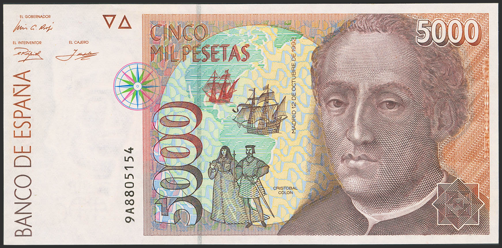 5000 Pesetas. 12 de Diciembre de 1992. Serie especial 9A. (Edifil 2023: 484b). Con ondulaciones naturales del proceso de fabricación (este es el único motivo de "quitarle" el SC). EBC+++.