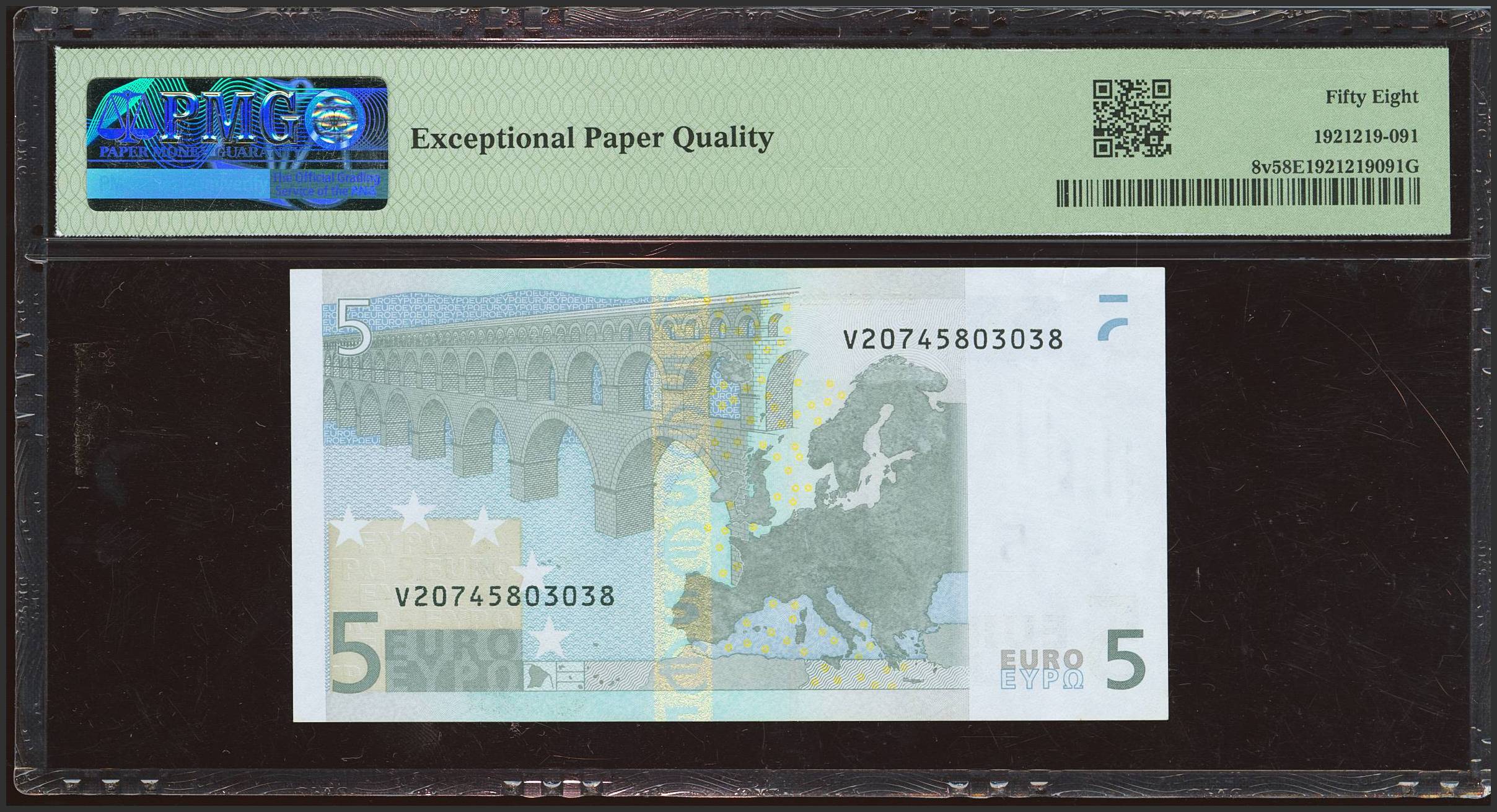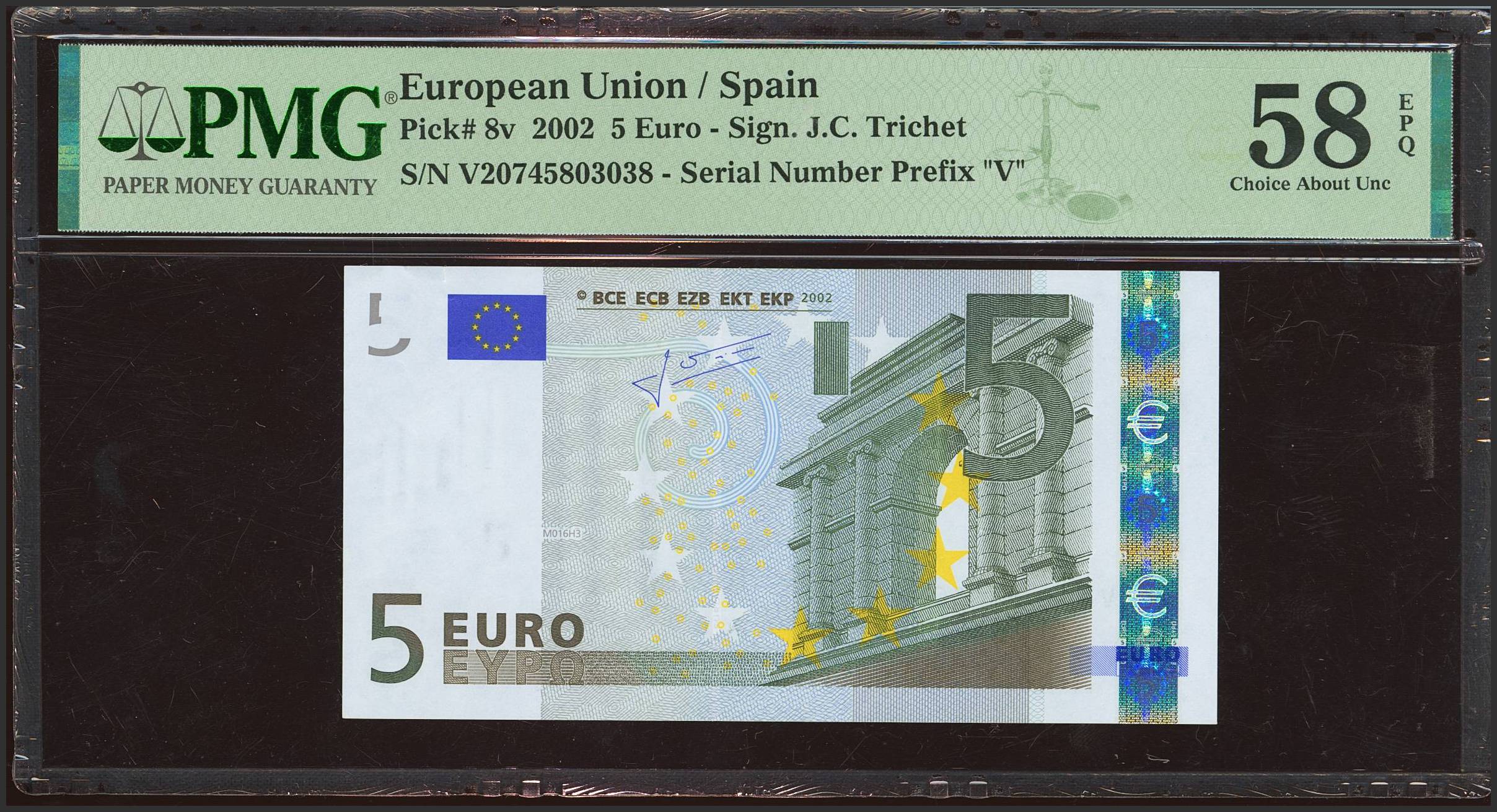 5 Euros. 1 de Enero de 2002. Firma Trichet. Serie V (España). (Edifil 2023: 486, Pick: 8v). EBC+++. Encapsulado PMG58EPQ.
