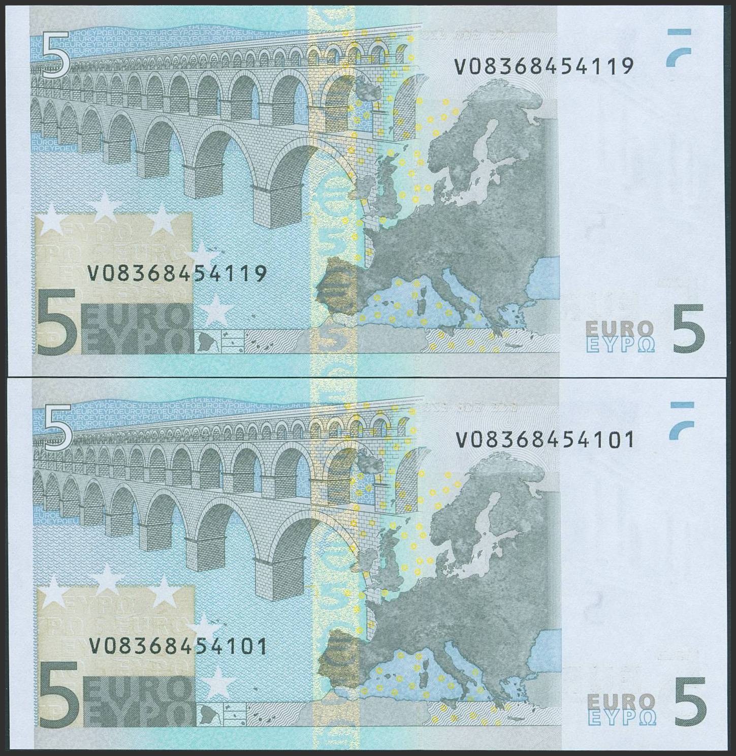 5 Euros. 1 de Enero de 2002. Pareja correlativa. Firma Trichet. Serie V (España) (cabe recordar que el último dígito de la numeración de todos los billetes denominados en euros es para control interno del Banco Central Europeo, el que marca la correlatividad de los billetes es el penúltimo dígito). (Edifil 2023: 486A). SC.