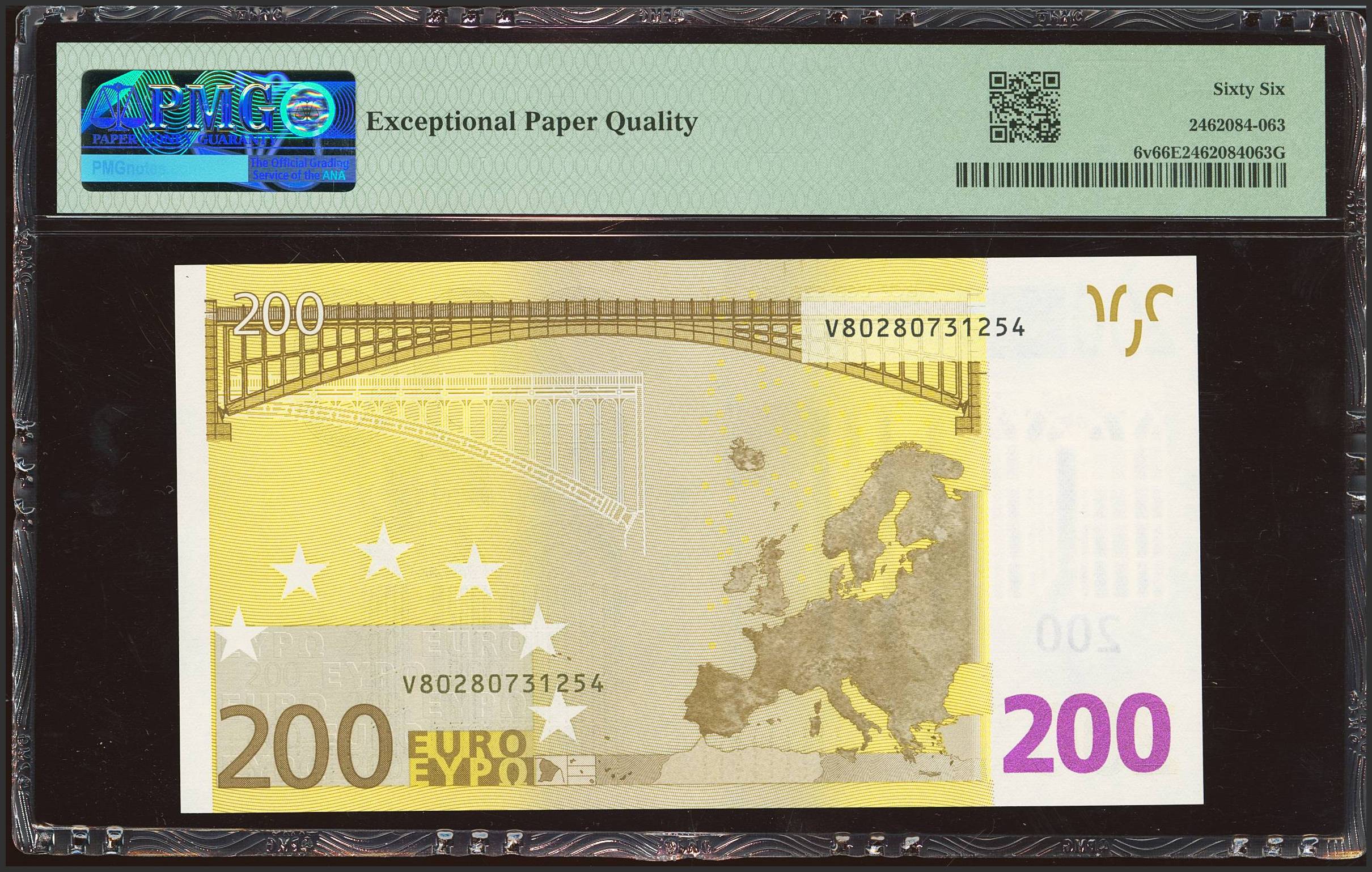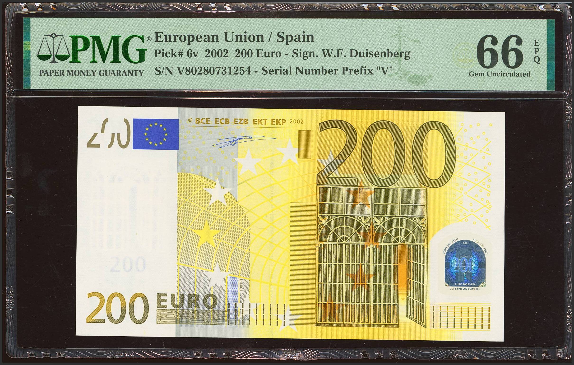 200 Euros. 1 de Enero de 2002. Firma Duisenberg. Serie V (España). (Edifil 2023: 491, Pick: 6V). SC. Encapsulado PMG66EPQ.