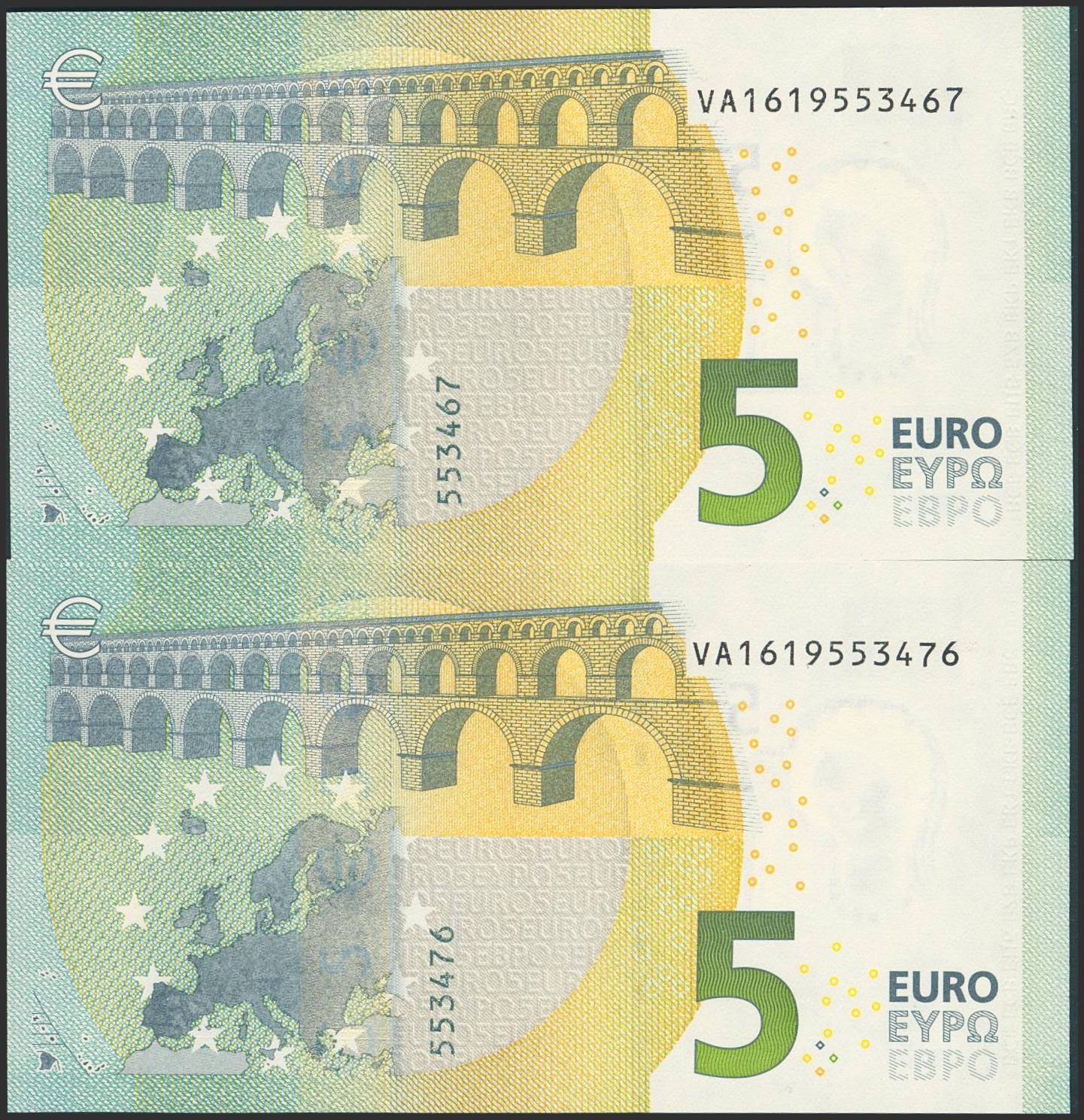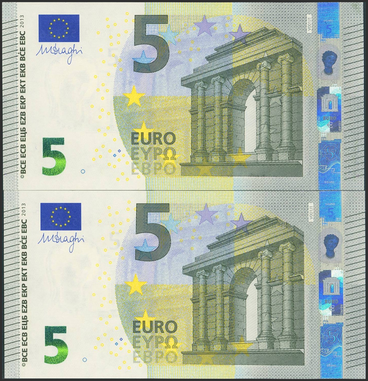 5 Euros. 2 de Mayo de 2013. Pareja correlativa (cabe recordar que el último dígito de la numeración de todos los billetes denominados en euros es para control interno del Banco Central Europeo, el que marca la correlatividad de los billetes es el penúltimo dígito). Firma Draghi. Serie V (España). (Edifil 2023: 493). SC.