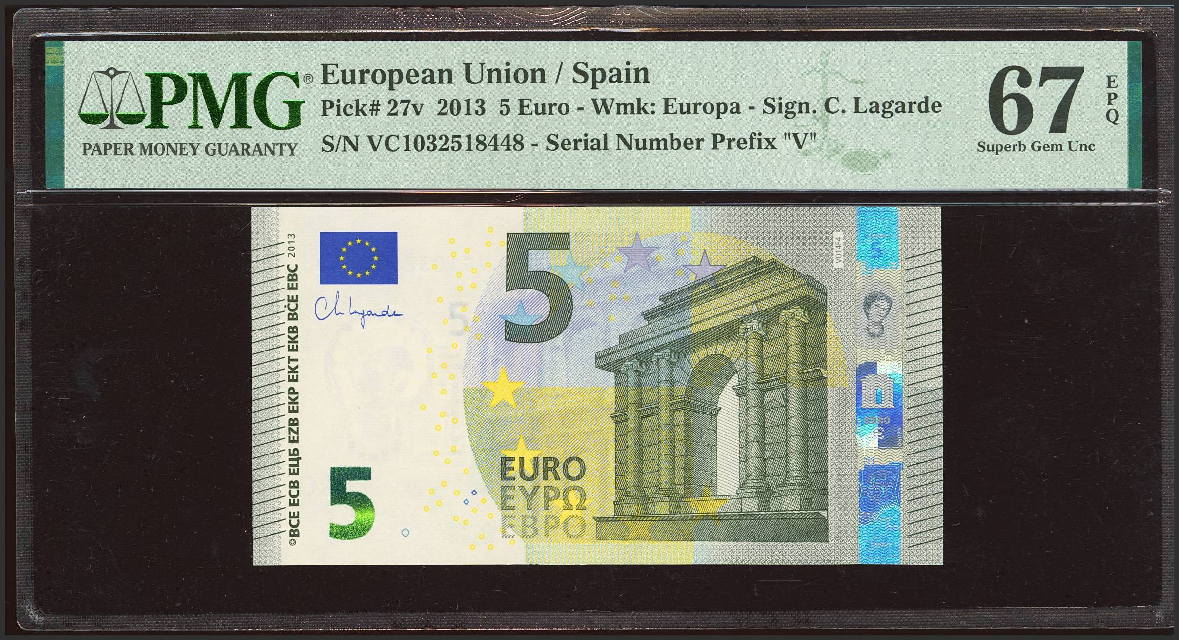 5 Euros. 2 de Mayo de 2013. Firma Lagarde. Serie VC (España). (Edifil 2023: 493Aa, Pick: 27v). SC. Encapsulado PMG67EPQ.
