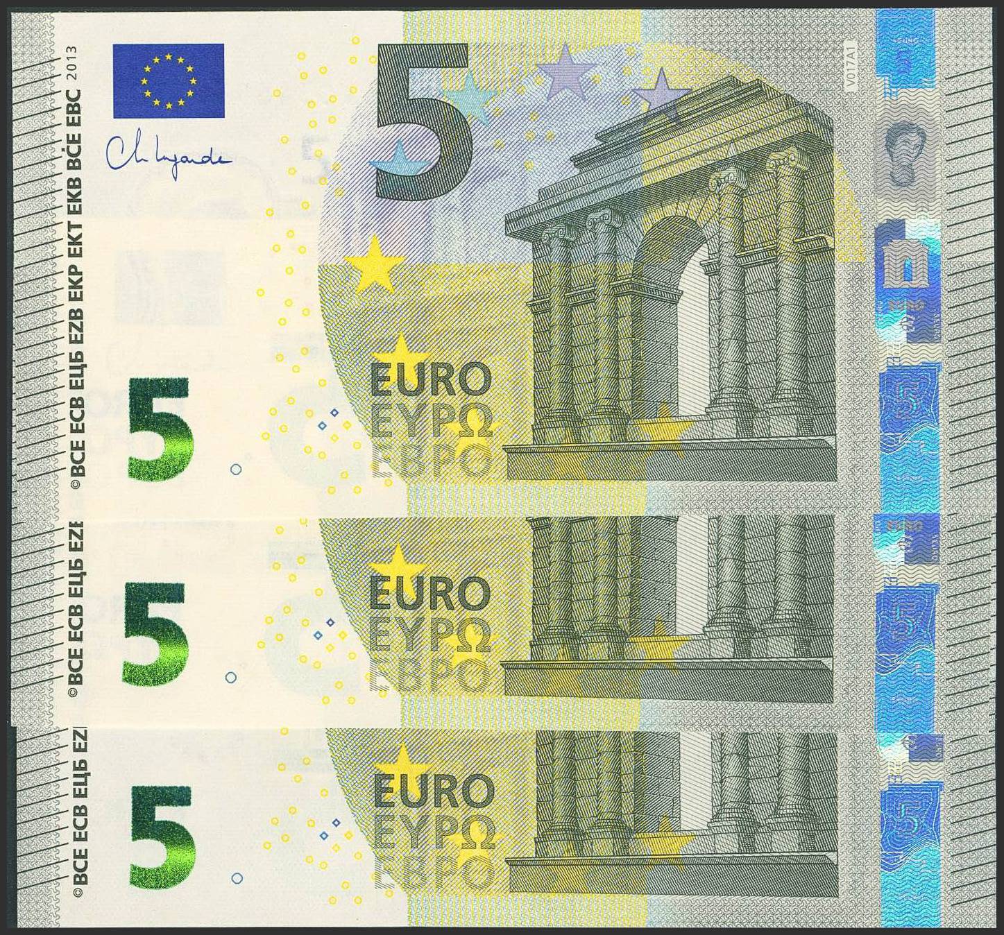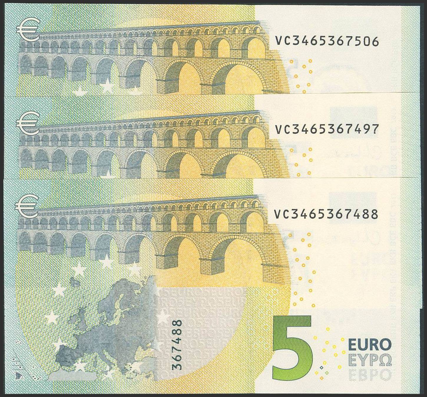 5 Euros. Noviembre 2013. Trío correlativo (cabe recordar que el último dígito de todos los billetes denominados en euros es para control interno del Banco Central Europeo, el que marca la correlatividad de los billetes es el penúltimo dígito). Firma Lagarde. Serie VC (España). (Edifil 2023: 493Aa). SC.