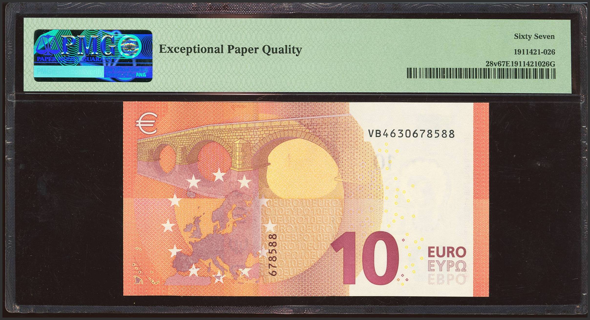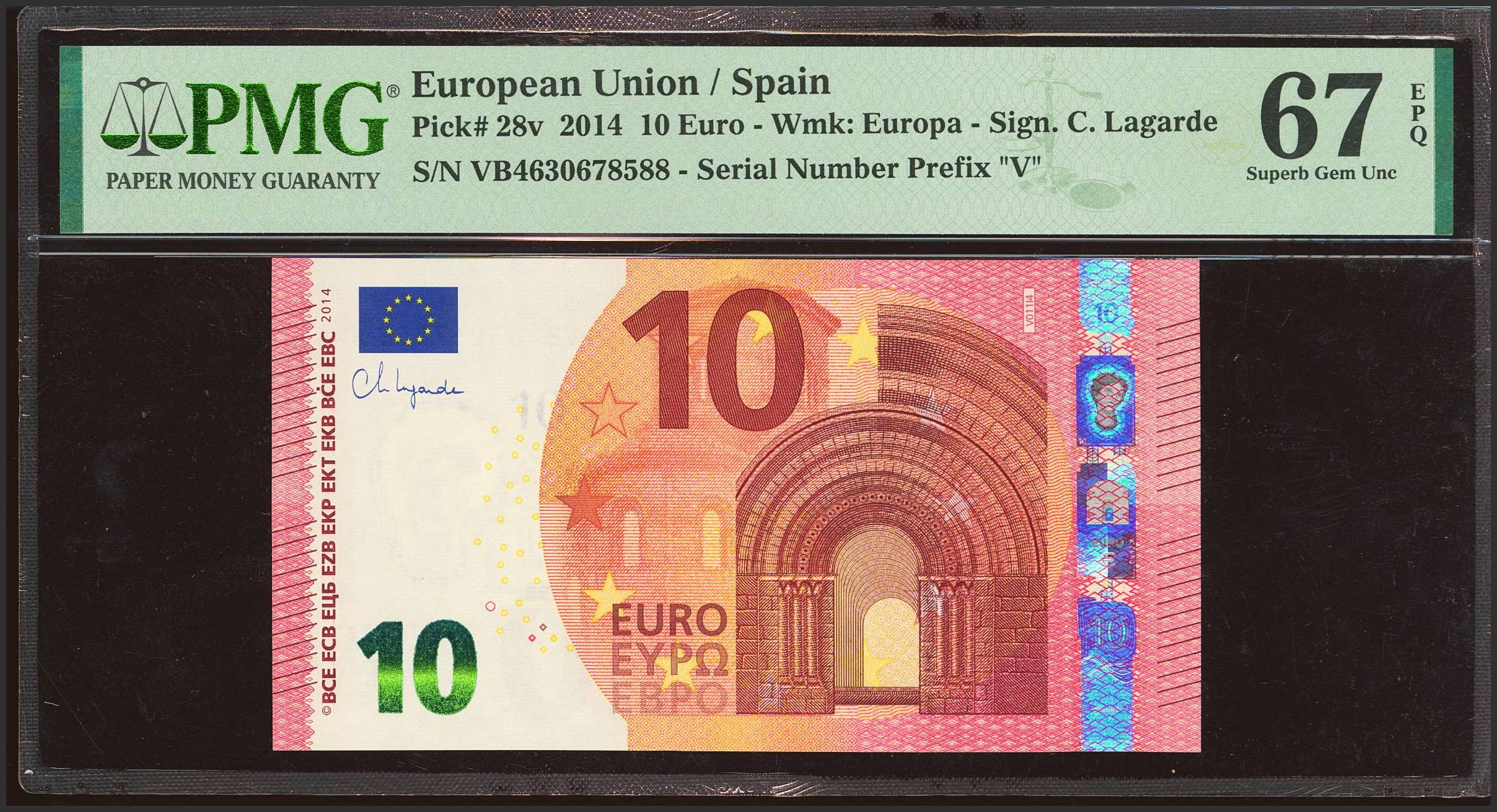 10 Euros. 23 de Septiembre de 2014. Firma Draghi. Serie VB (España). (Edifil 2023: 494A, Pick: 21v). SC. Encapsulado PMG67EPQ