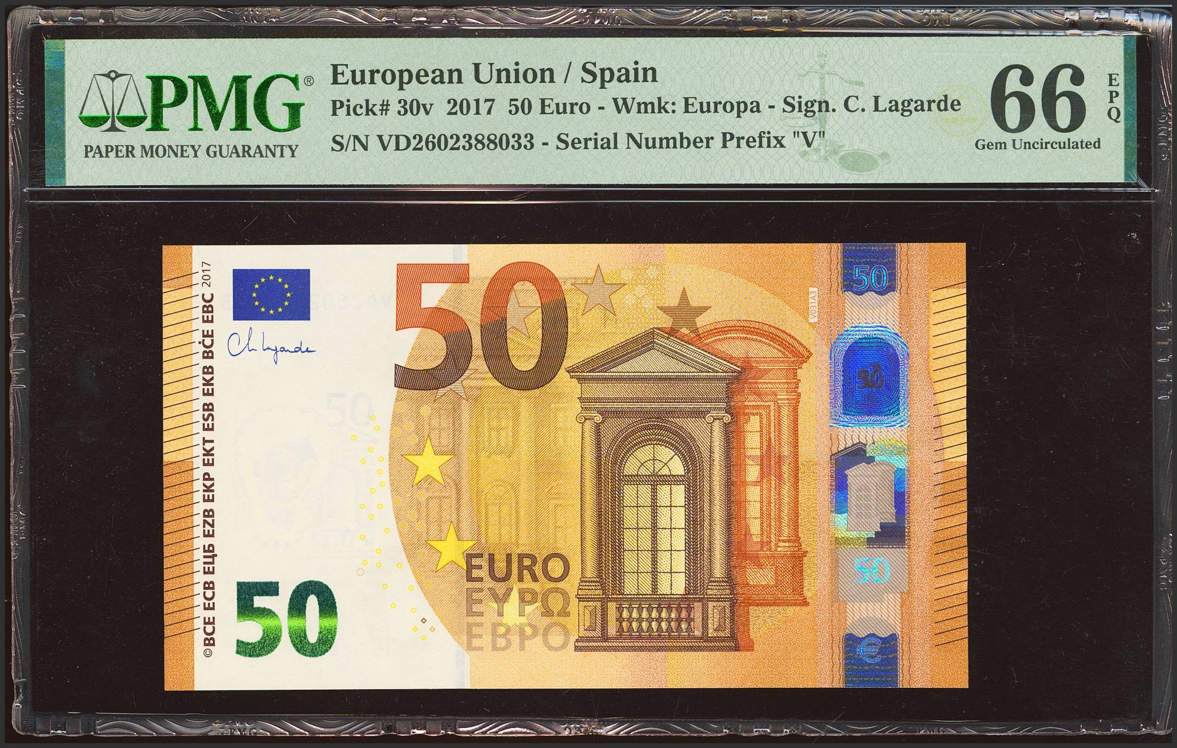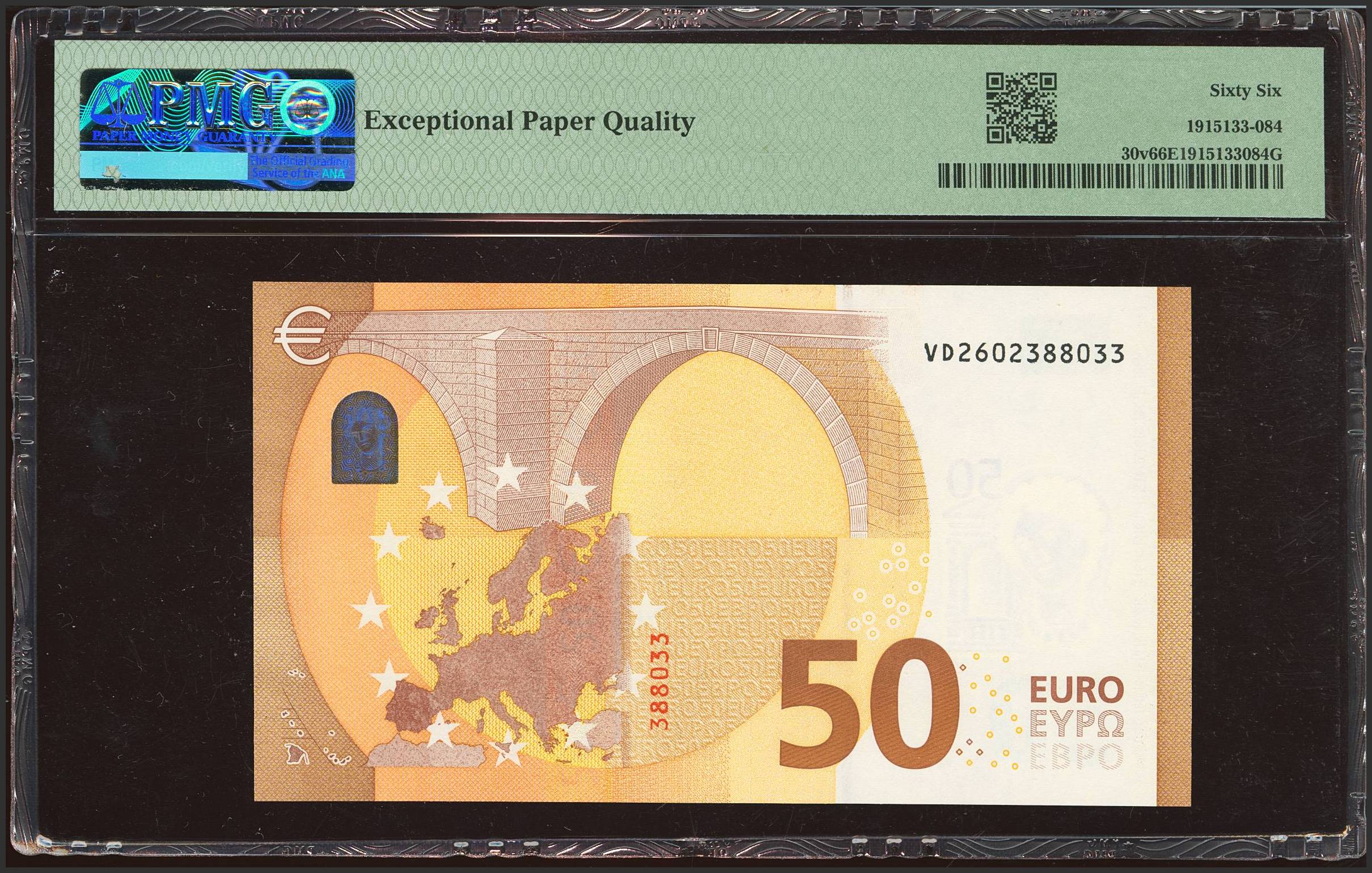 50 Euros. 4 de Abril de 2017. Firma Draghi. Serie VD (España). (Edifil 2023: 496Ab, Pick: 23v). SC. Encapsulado PMG66EPQ