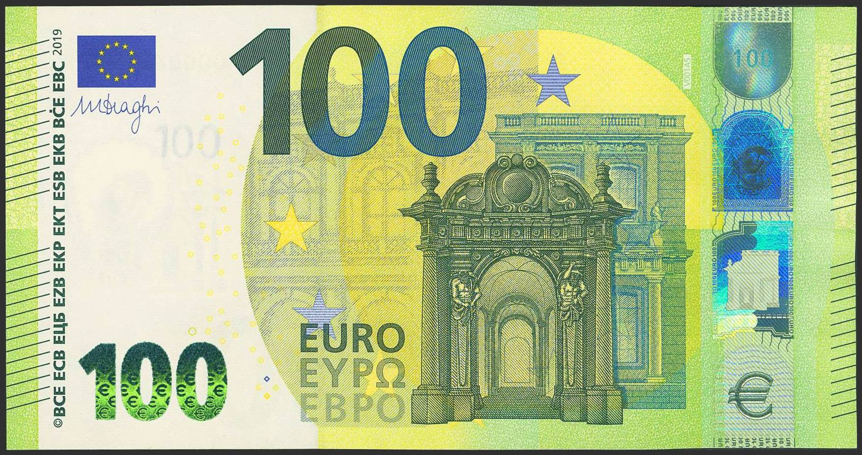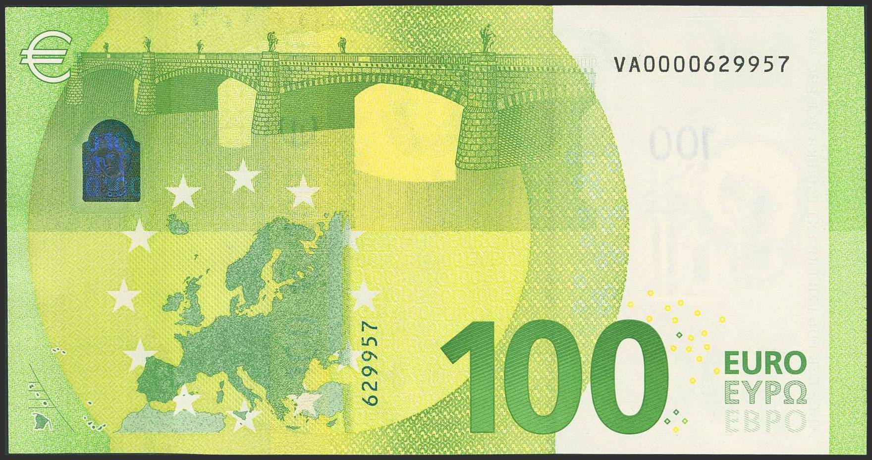 100 Euros. 2019. Firma Draghi. Serie VA (España) y numeración muy baja. (Edifil 2023: 497, Pick: 24v). SC.