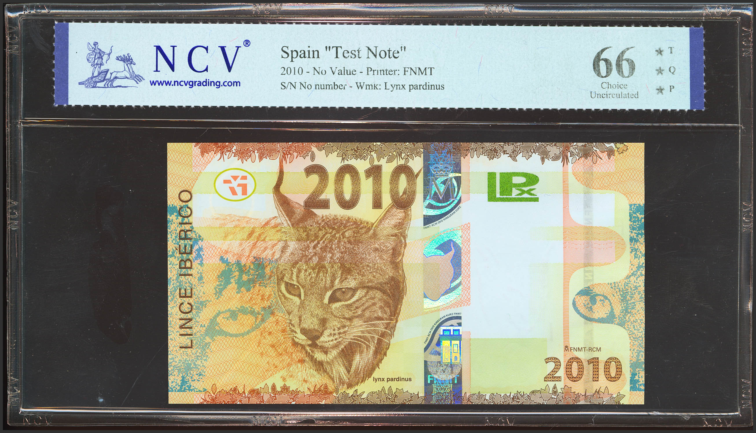 Prueba de billete de la FNMT, emitido en el 2010. Sin numeración. (Edifil 2023: 2). SC. Encapsulado NCV66TQP.