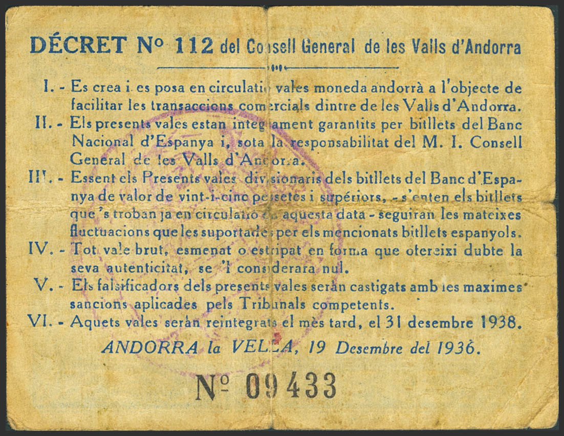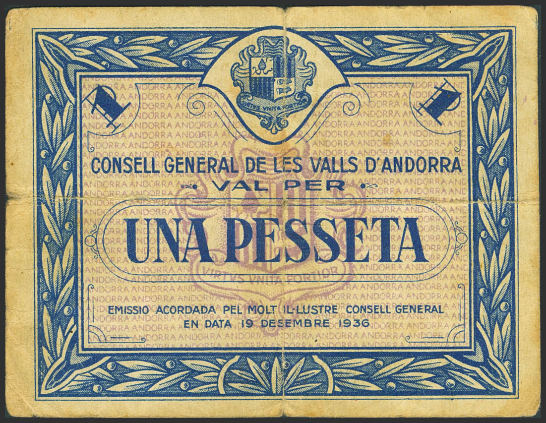 ANDORRA. 1 Pesseta. 19 de Diciembre de 1936. Sin serie. (Edifil 2023: 2). MBC.