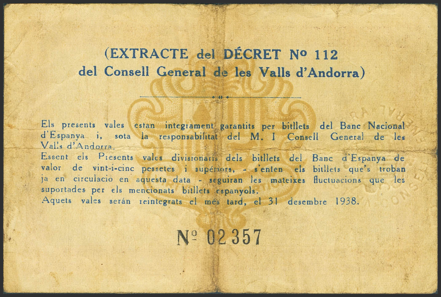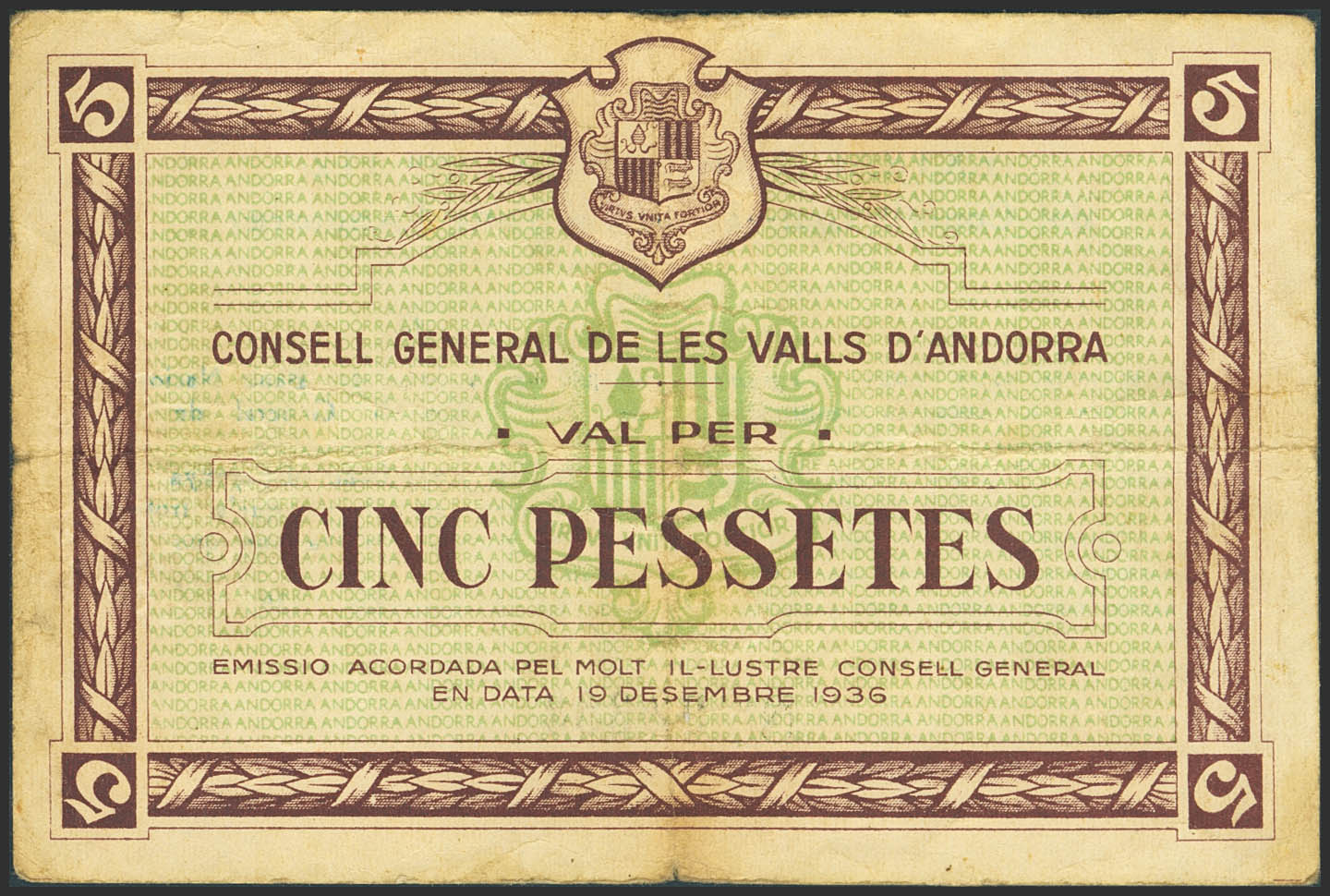 ANDORRA. 5 Pessetes. 19 de Diciembre de 1936. (Edifil 2023: 7). Raro. MBC.