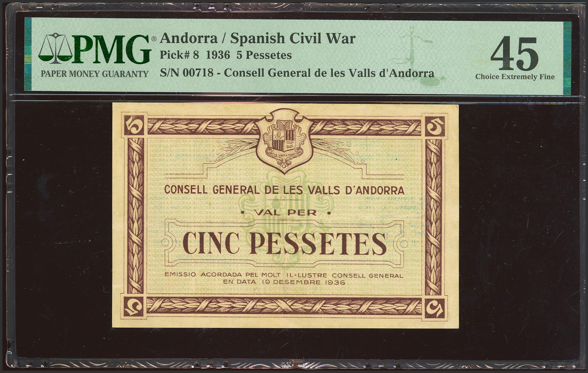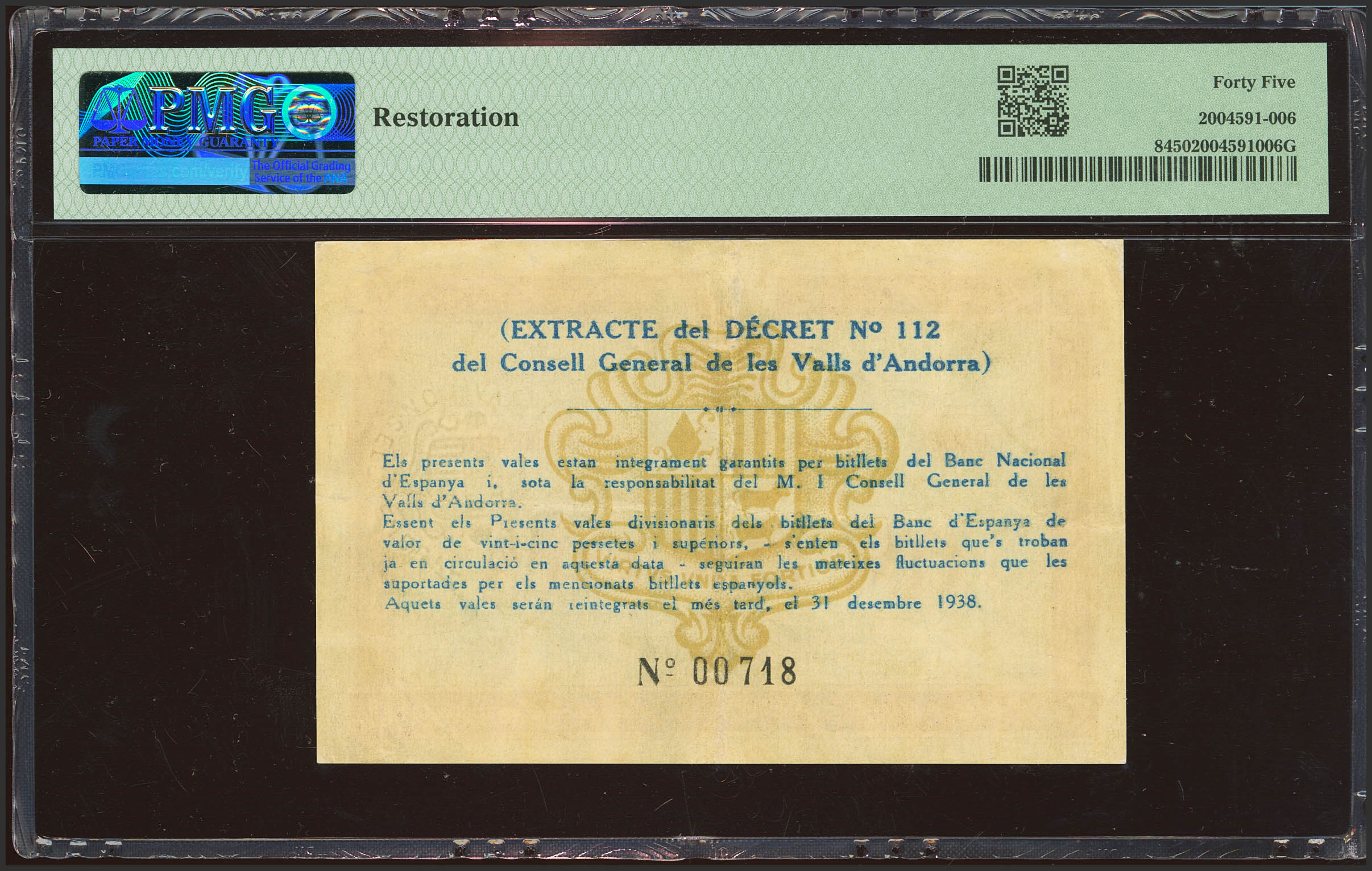 ANDORRA. 5 Pessetes. 19 de Diciembre de 1936. Sin serie y numeración bajísima (Nº000718). (Edifil 2023: 7, Pick: 8). Muy raro. EBC-. Encapsulado PMG45 (restoration).