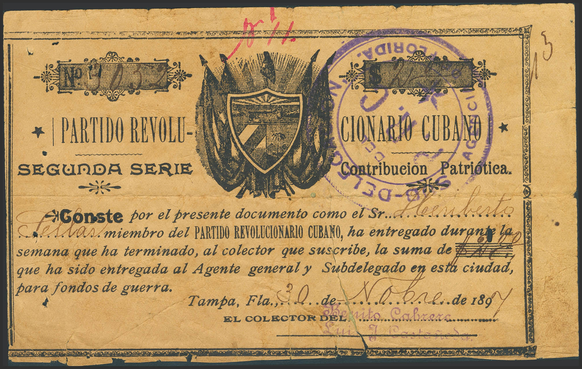 PARTIDO REVOLUCIONARIO CUBANO (SEGUNDA SERIE). 2 Dólares. 30 Noviembre de 1894. (Echenagusía: Página 84, Cuba Museo: P-23). Rarísimo documento de contribución patriótica durante la guerra de la independencia, con la estampilla del recolector, en Ibercoin solo tenemos constancia de otro más y el del museo de Cubano (con otra fecha), pieza de gran espectacularidad. RC.