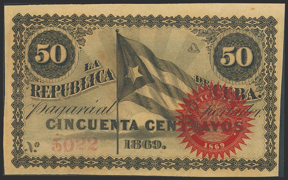 REPUBLICA DE CUBA. 50 Centavos. 1869. Serie A. (Edifil 2023: 30). Conserva gran parte del apresto original. EBC+++.