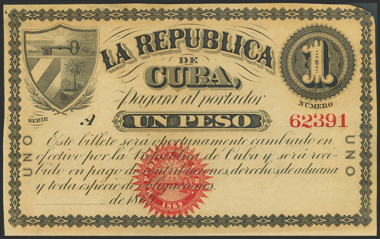 REPUBLICA DE CUBA. 1 Peso. 1869. Serie A. (Edifil 2023: 31). Apresto original, ligeras sombras del tiempo. EBC++.