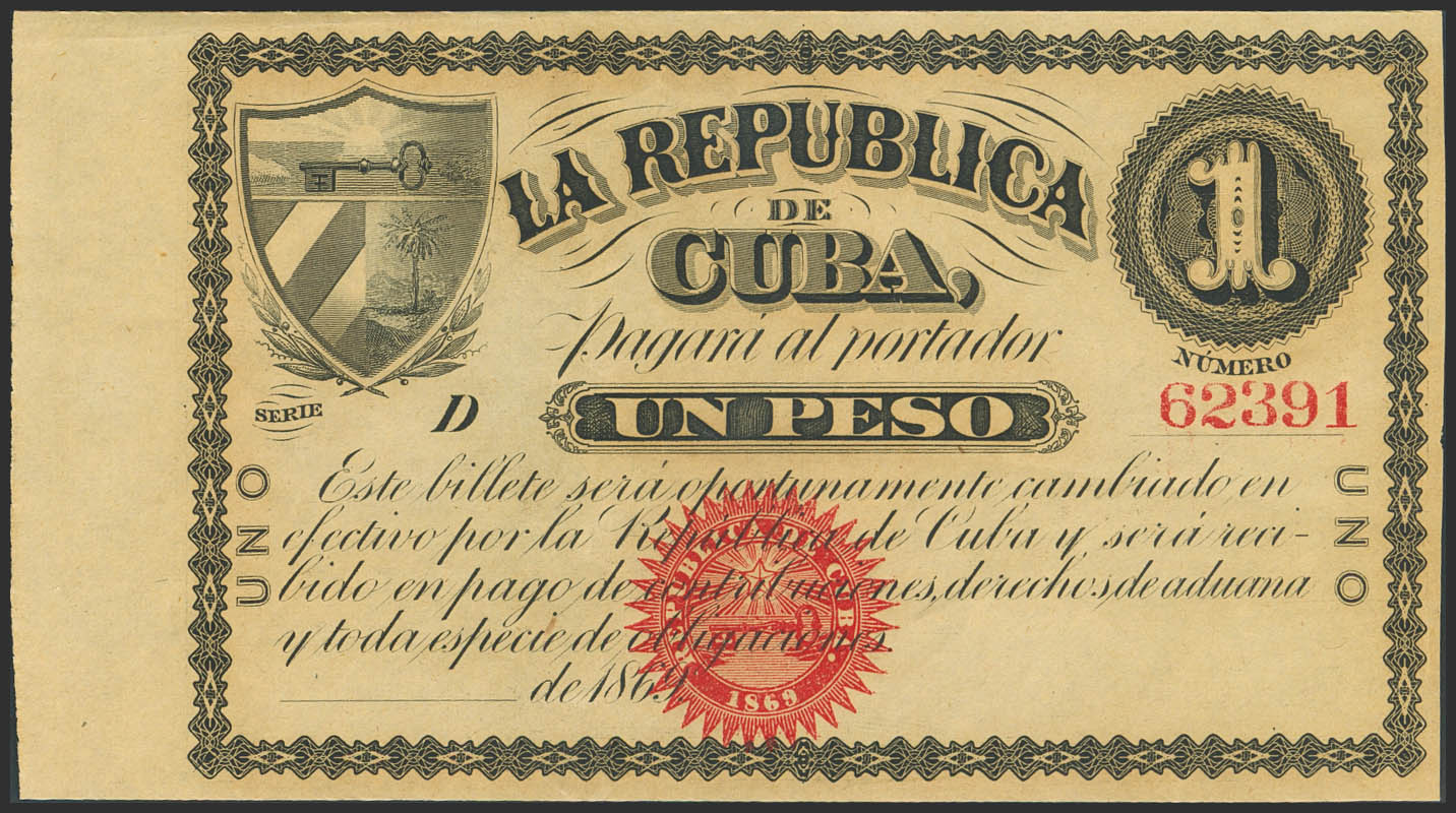 REPUBLICA DE CUBA. 1 Peso. 1869. Serie D. (Edifil 2023: 31). Apresto original, ligeras sombras del tiempo. EBC++.