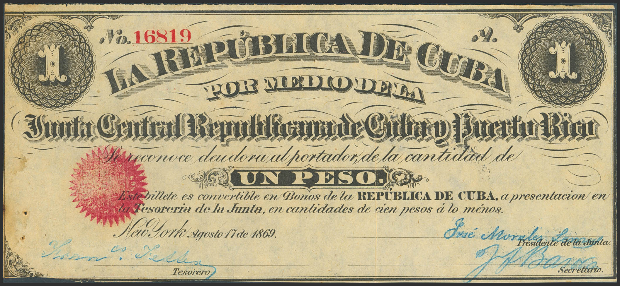 REPUBLICA DE CUBA. 1 Peso. 17 de Agosto de 1869. Serie A. (Edifil 2023: 35). Raro, apresto original, ligeras sombras del tiempo y puntitos de "polilla". EBC++.