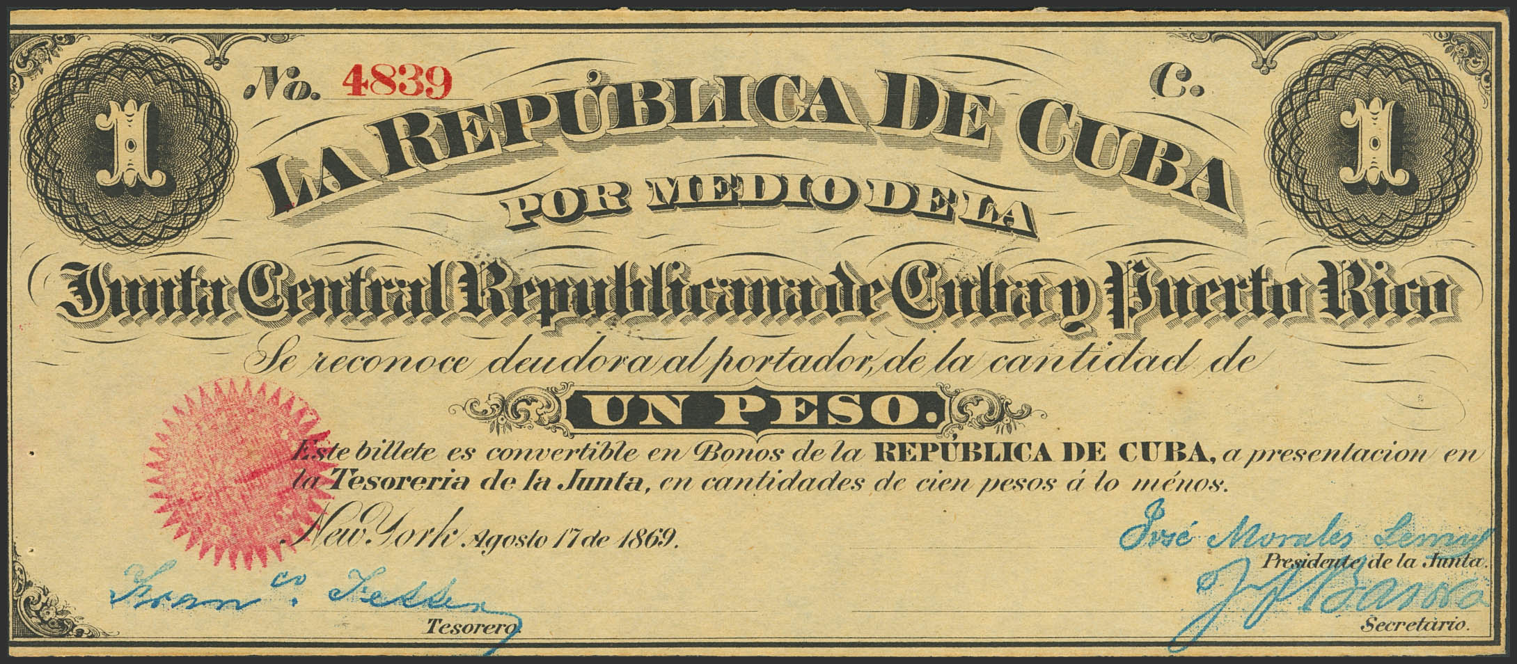 REPUBLICA DE CUBA. 1 Peso. 17 de Agosto de 1869. Serie C. (Edifil 2023: 35). Raro, apresto original. SC-.