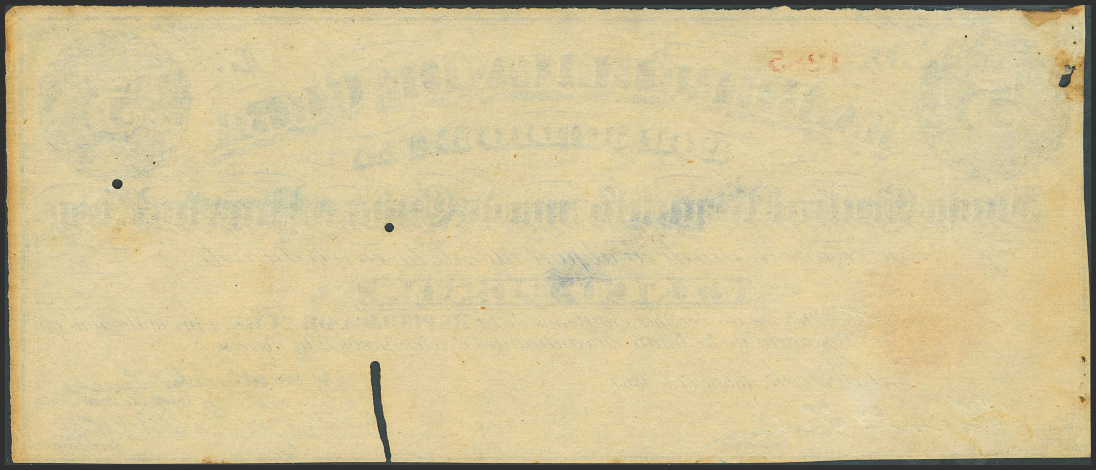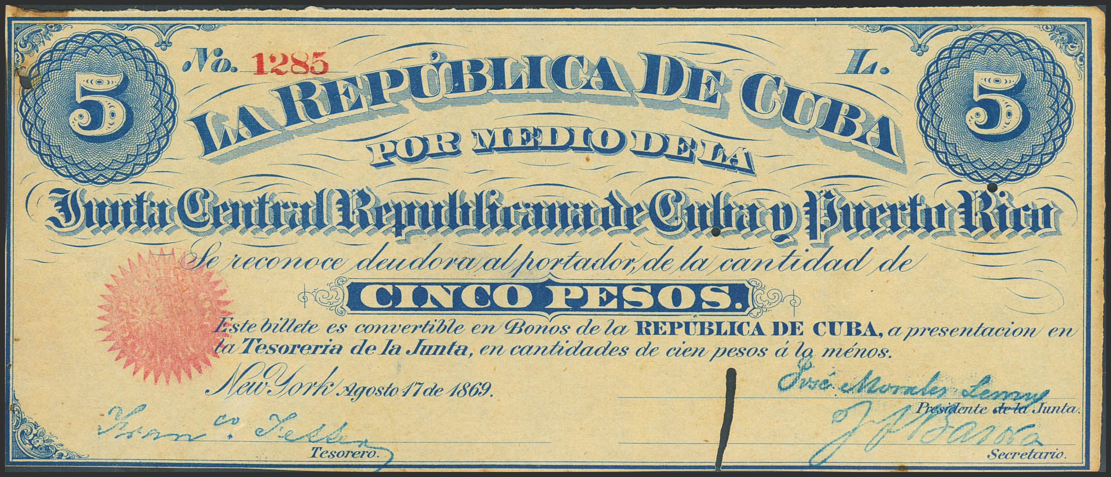 REPUBLICA DE CUBA. 5 Pesos. 17 de Agosto de 1869. Serie L. (Edifil 2023: 36). Rarísimo, apresto original, ligeras sombras del tiempo y puntos de "polilla". EBC+.