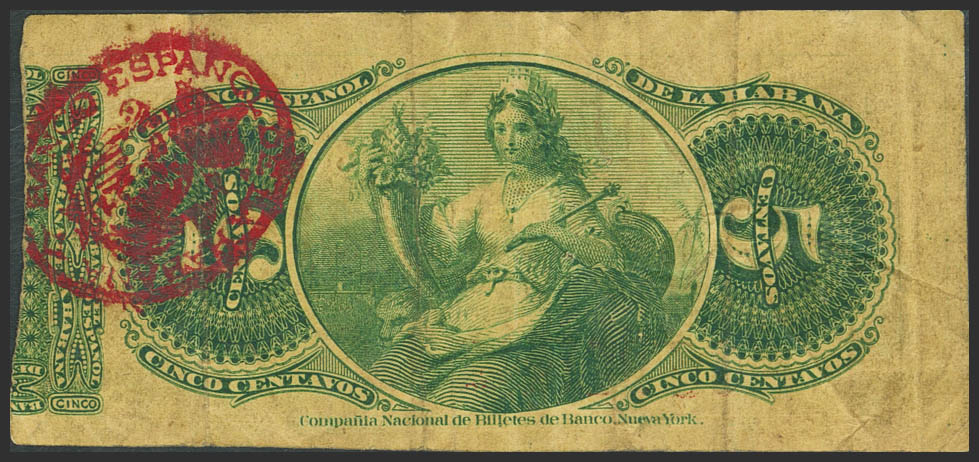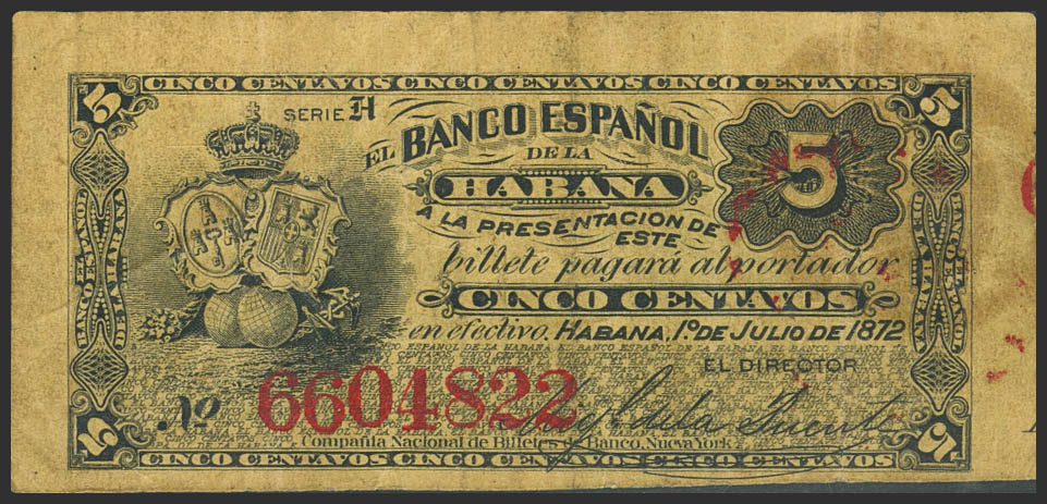 BANCO ESPAÑOL DE LA HABANA. 5 Centavos. 1 de Julio de 1872. Serie H. (Edifil 2023: 41). MBC.