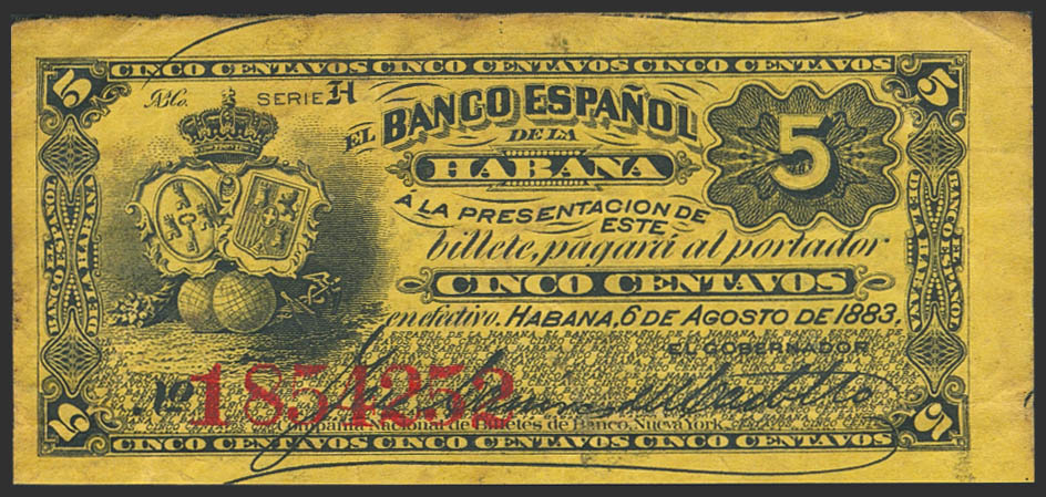 BANCO ESPAÑOL DE LA HABANA. 5 Centavos. 6 de Agosto de 1883. Serie H. (Edifil 2023: 43). MBC.