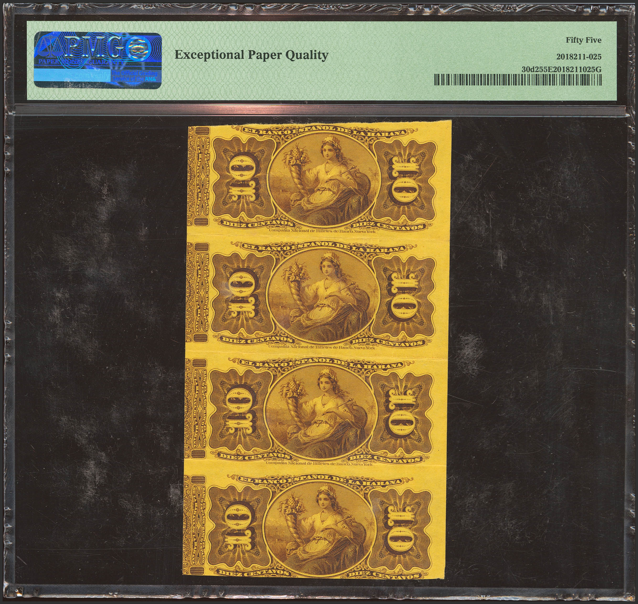 BANCO ESPAÑOL DE LA HABANA. Conjunto de 4 billetes casi correlativos de 10 Centavos (sin guillotinar) emitidos el 6 de Agosto de 1886. Serie G. (Edifil 2023: 46, Pick: 30d2). Rarísimo, especialmente en esta excepcional calidad. EBC+. Encapsulado PMG55EPQ.