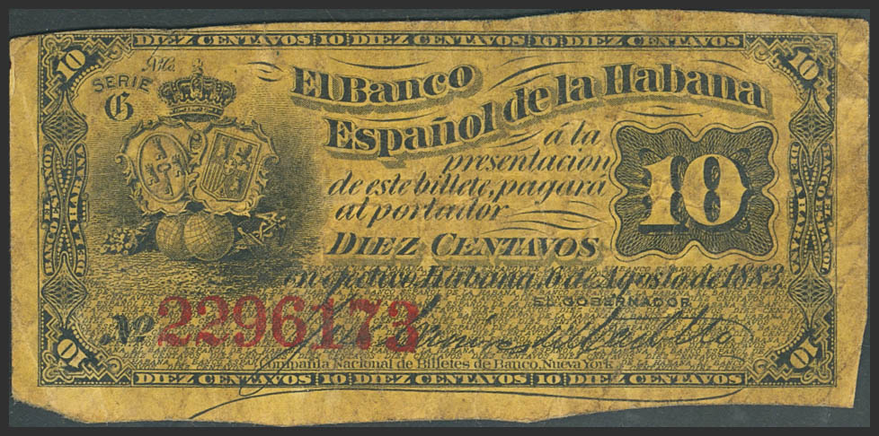 BANCO ESPAÑOL DE LA HABANA. 10 Centavos. 6 de Agosto de 1883. Serie G. (Edifil 2023: 46). MBC.
