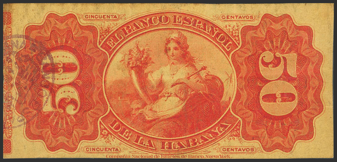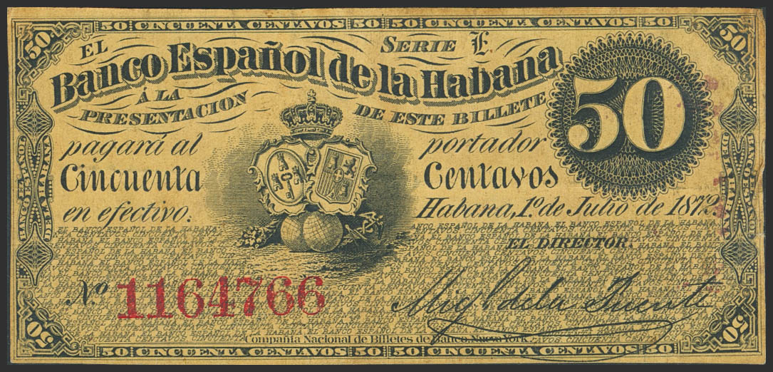BANCO ESPAÑOL DE LA HABANA. 50 Centavos. 1 de Julio de 1872. Serie F. (Edifil 2023: 49). Muy raro. MBC+.