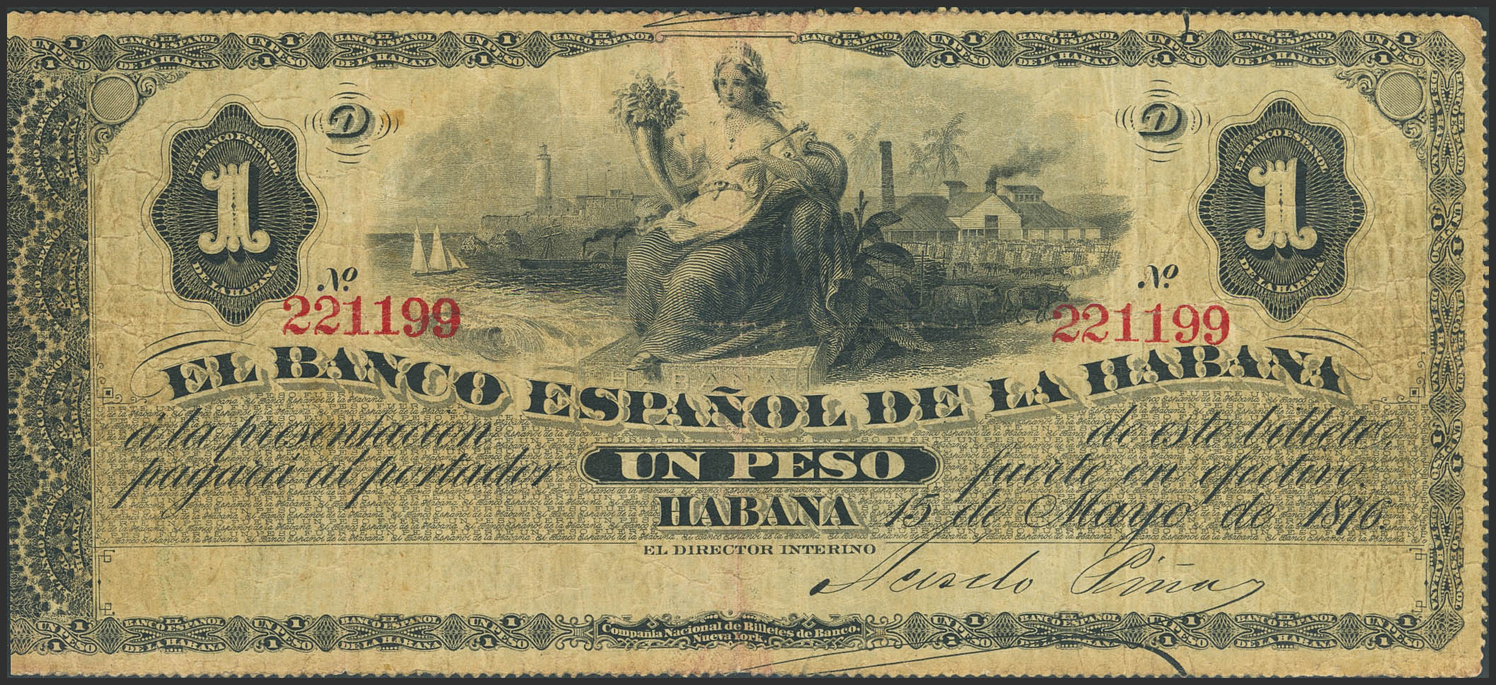 BANCO ESPAÑOL DE LA HABANA. 1 Peso. 15 de Mayo de 1876. Serie D. (Edifil 2023: 53). Rarísimo. MBC.