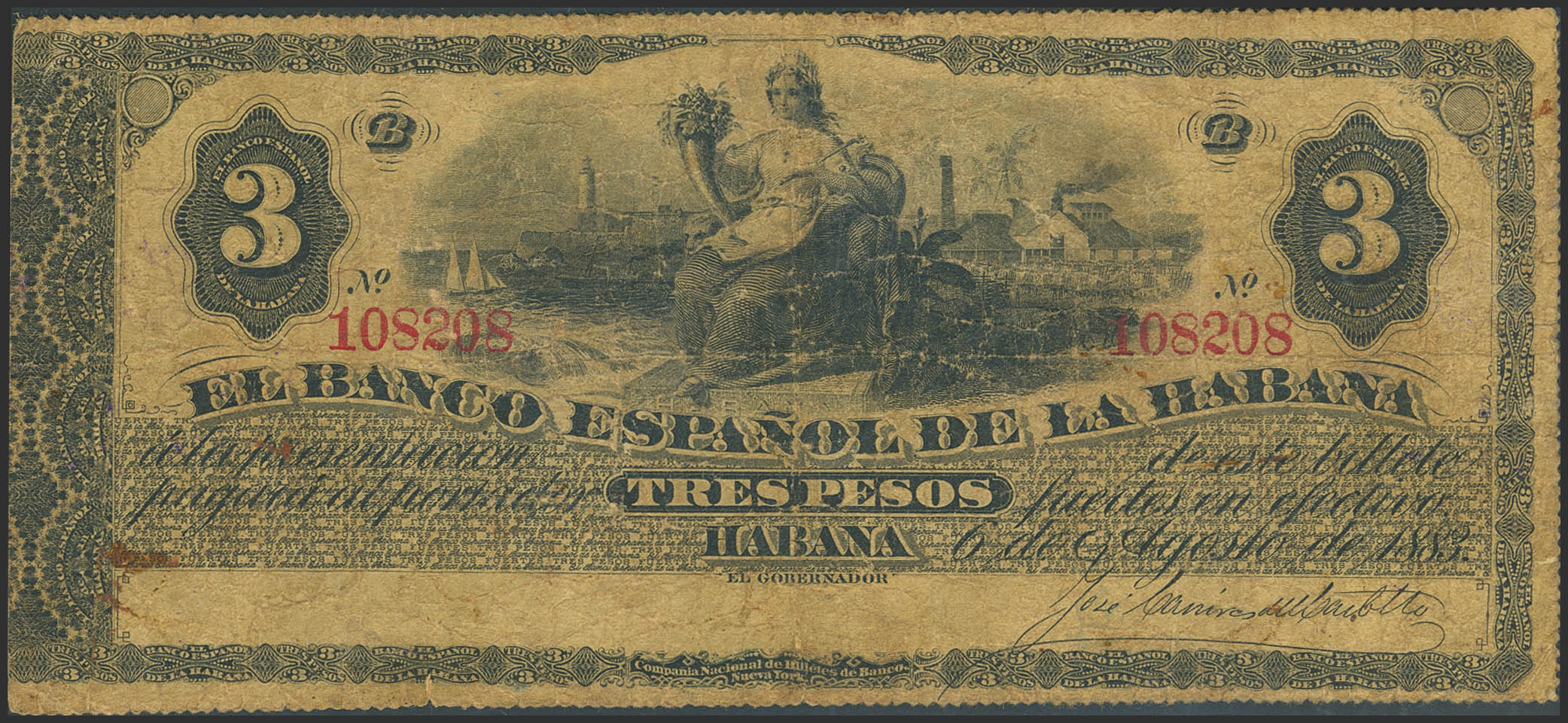 BANCO ESPAÑOL DE LA HABANA. 3 Pesos. 6 de Agosto de 1983. Serie B. (Edifil 2023: 61). Rarísimo. MBC.