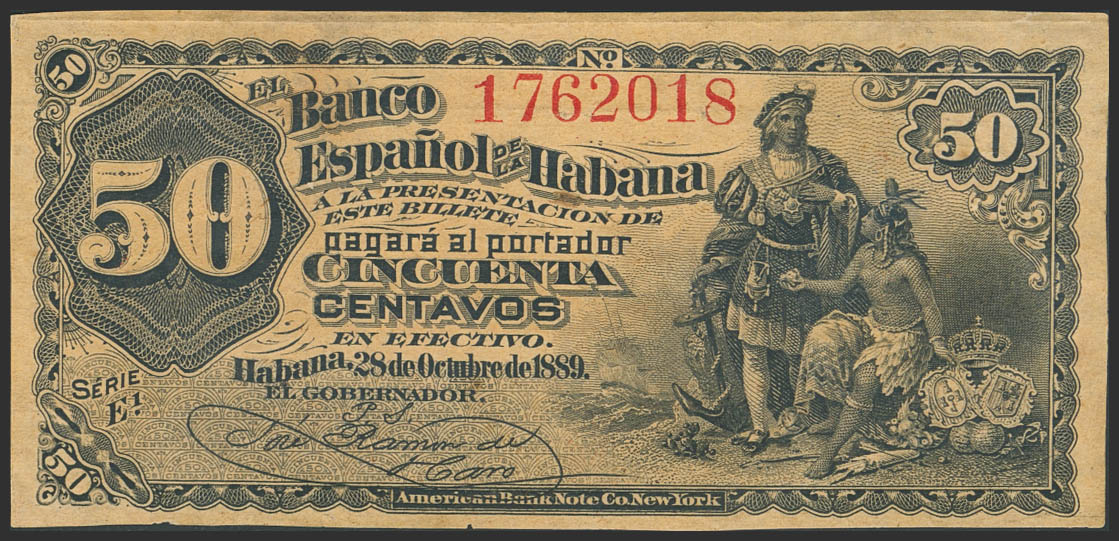BANCO ESPAÑOL DE LA HABANA. 50 Centavos. 28 de Octubre de 1889. Serie E. (Edifil 2023: 62). Muy raro, especialmente en esta calidad, apresto original. SC-.