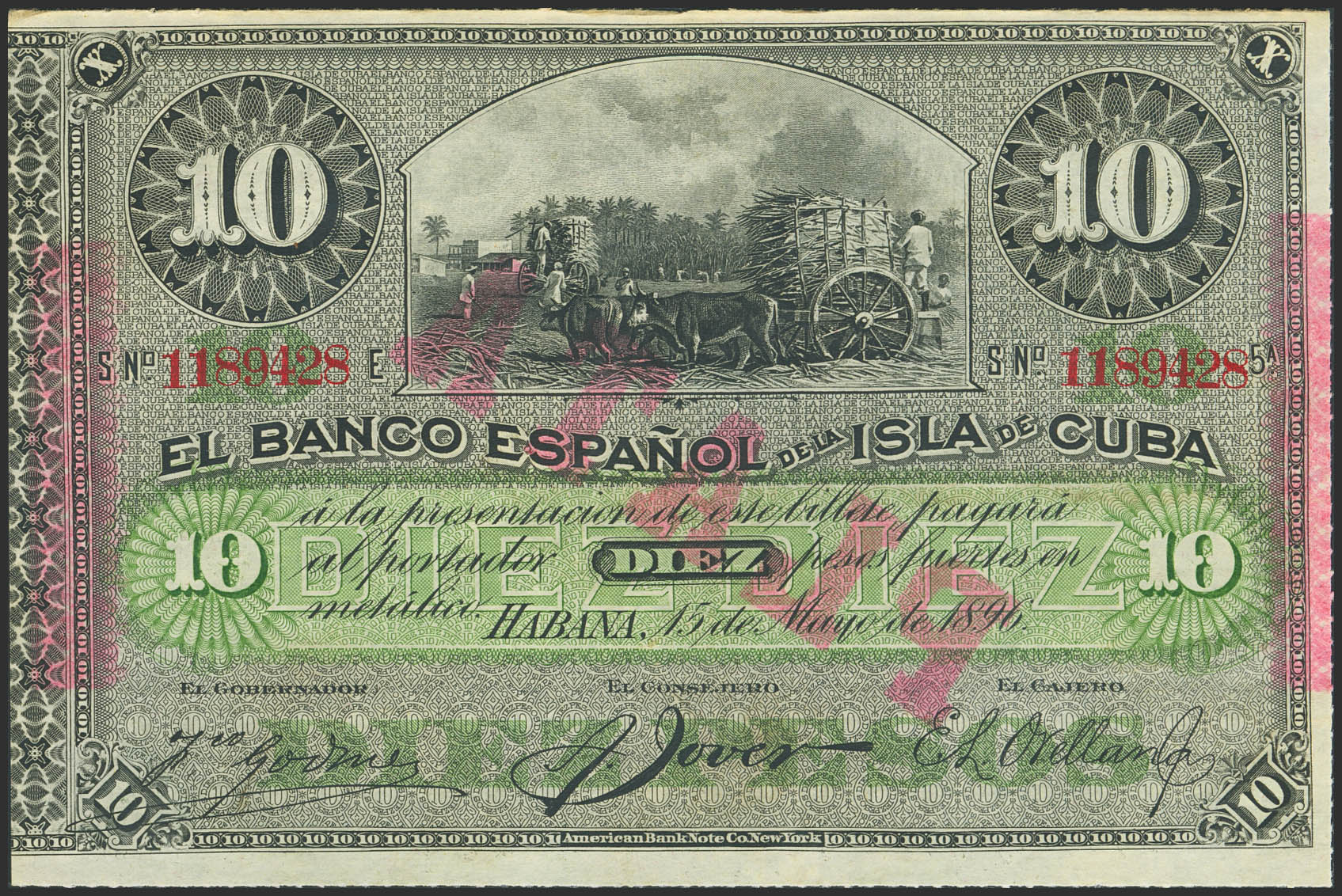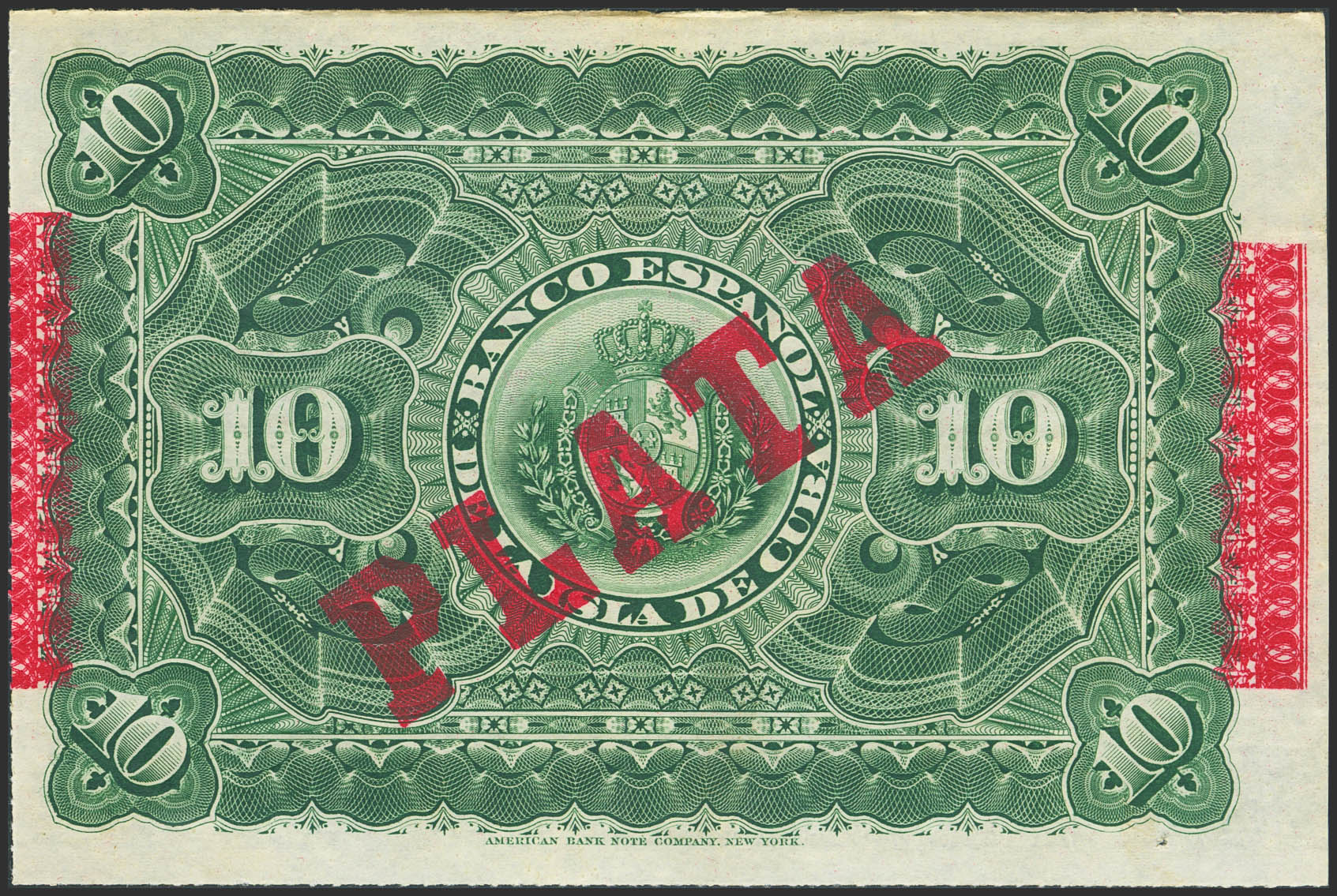 BANCO ESPAÑOL DE LA ISLA DE CUBA. 10 Pesos. 15 de Agosto de 1896. Sobrecarga PLATA, en el reverso y en el anverso sobrecarga calcada PLATA (dando la apariencia de sobrecarga invertida). Serie E. (Edifil 2023: 82). Conserva gran parte de su apresto original. EBC+.