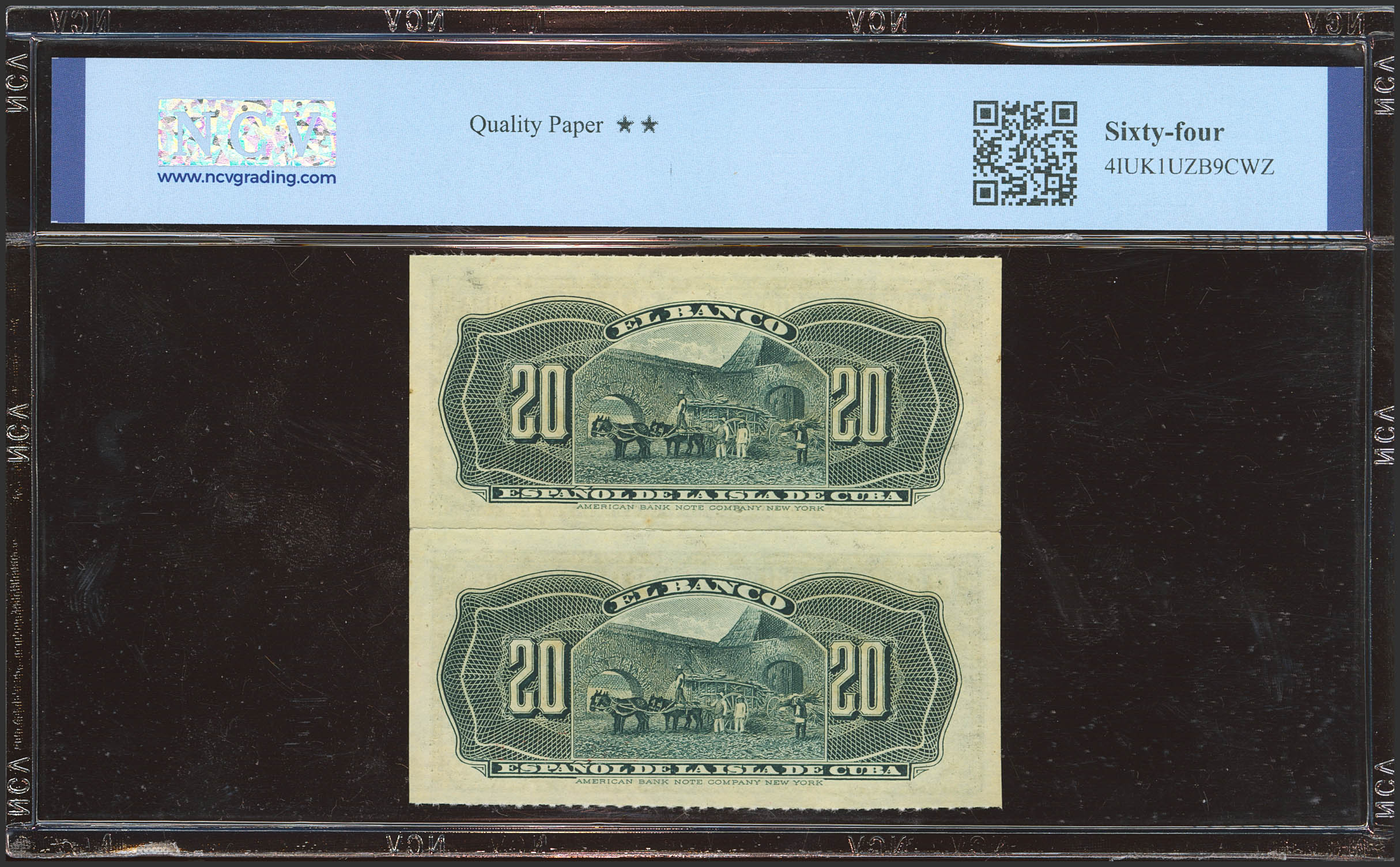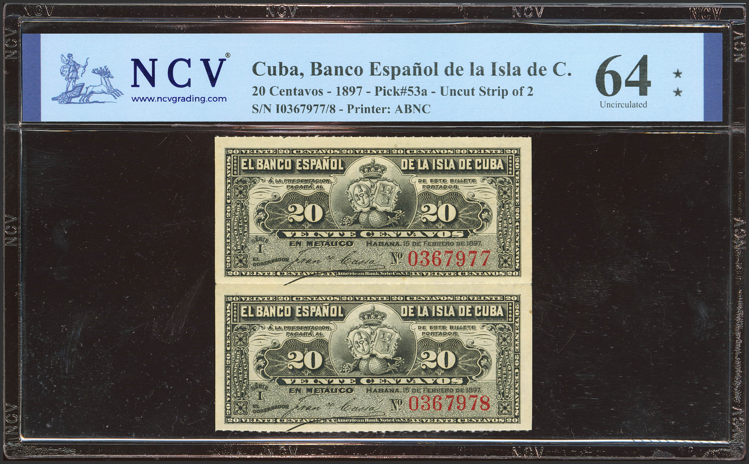 BANCO ESPAÑOL DE LA ISLA DE CUBA. Conjunto de 2 billetes correlativos de 20 Centavos (sin desprender), emitidos el 15 de Febrero de 1897. Serie I. (Edifil 2023: 85, Pick: 53a). Inusual. SC. Encapsulado NCV64.