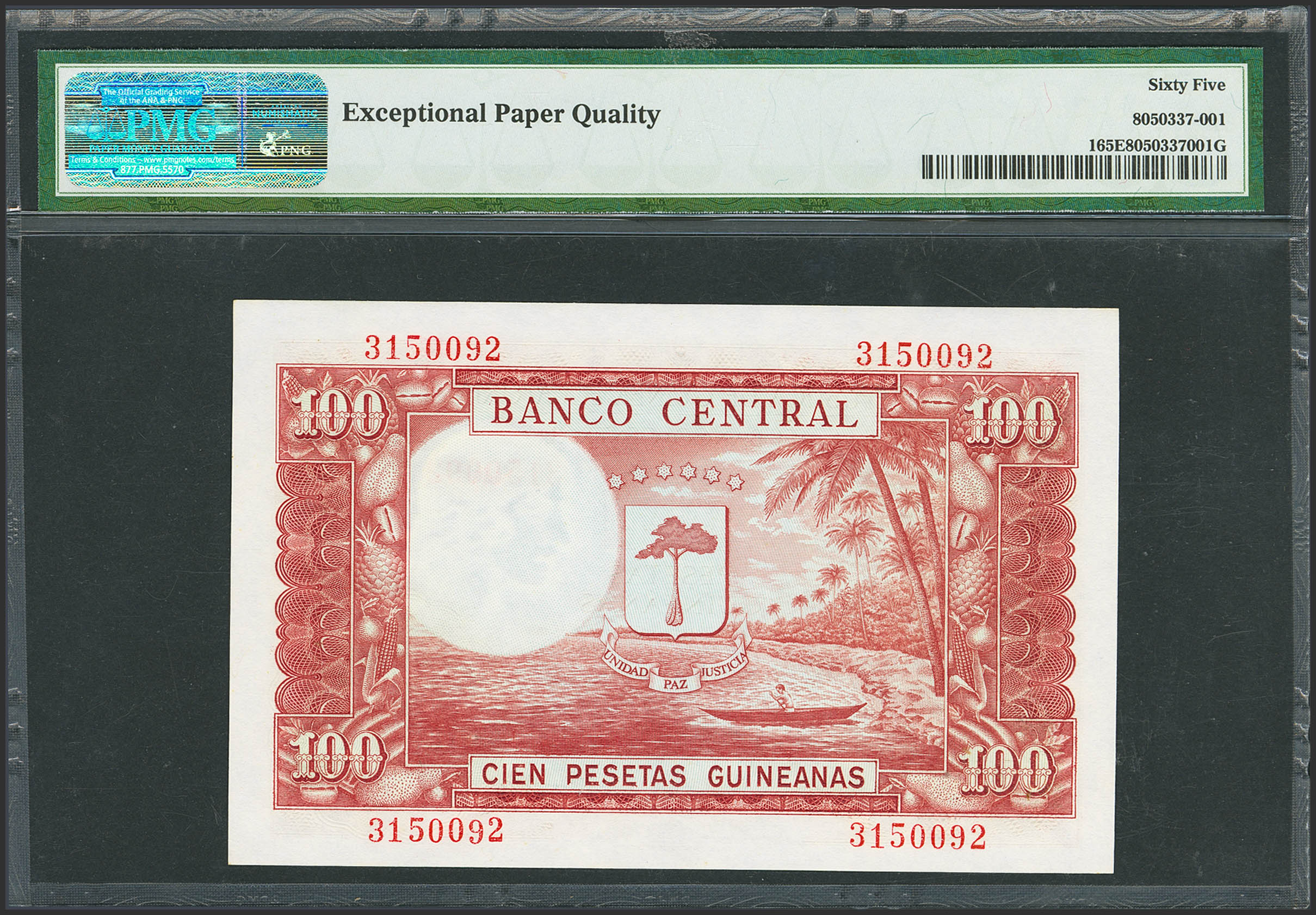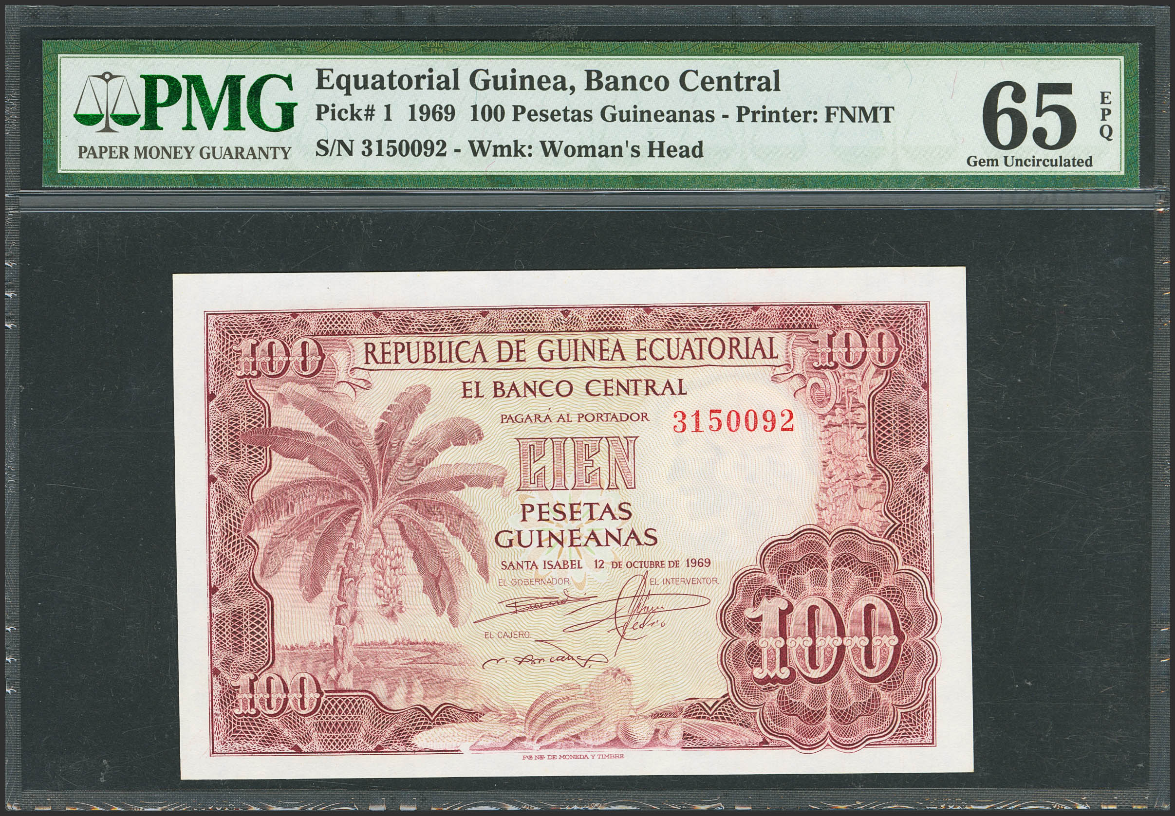 GUINEA ECUATORIAL. 100 Pesetas. 12 de Octubre de 1969. Sin serie. (Edifil 2023: 1, Pick: 1). Inusual en esta excepcional calidad, apresto original. SC. Encapsulado PMG65EPQ.