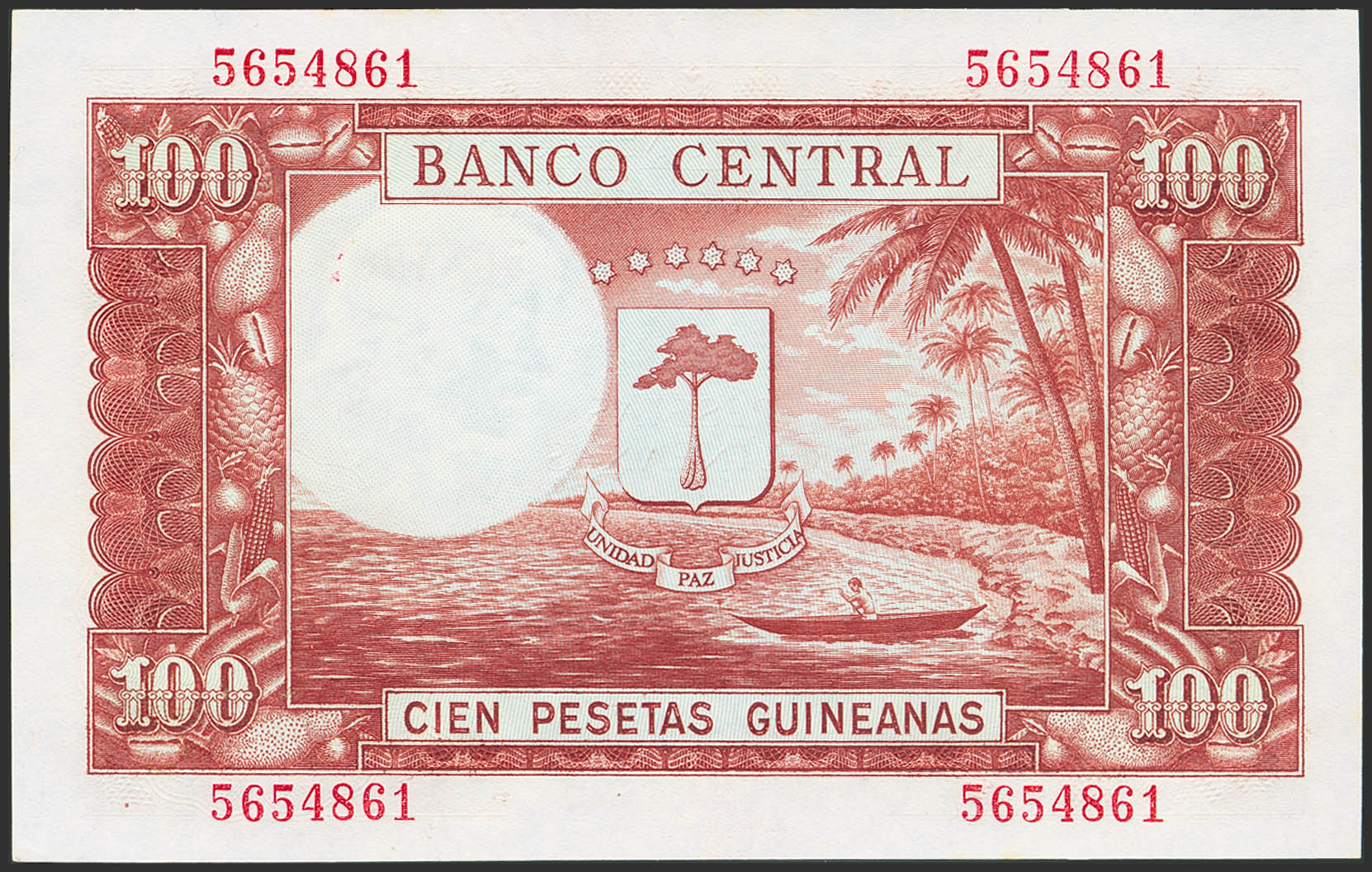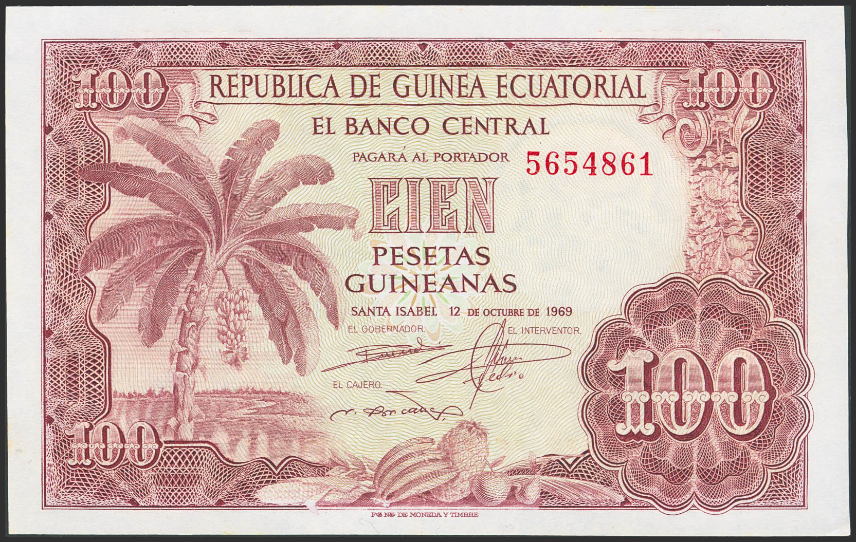 GUINEA ECUATORIAL. 100 Pesetas. 12 de Octubre de 1969. Sin serie. (Edifil 2023: 1). Apresto original. SC.