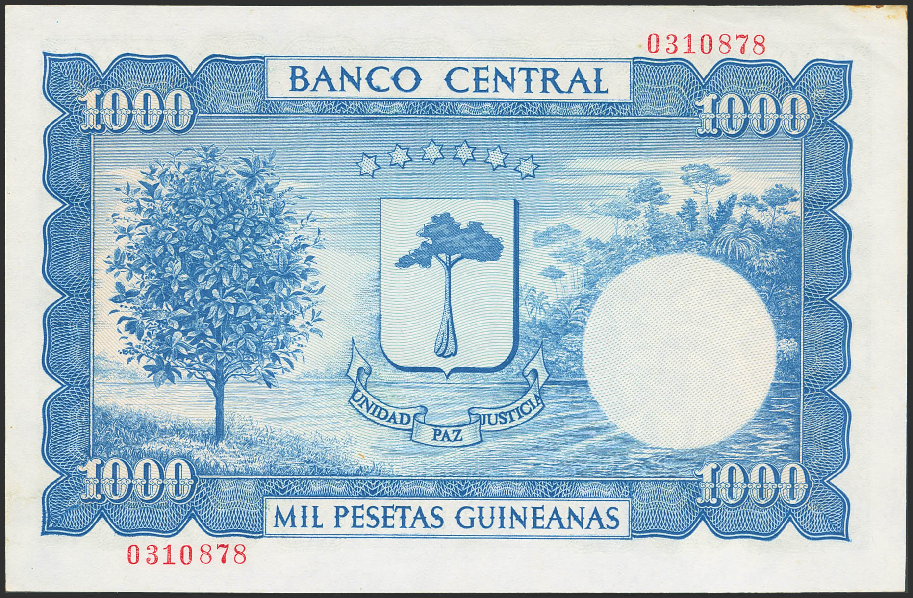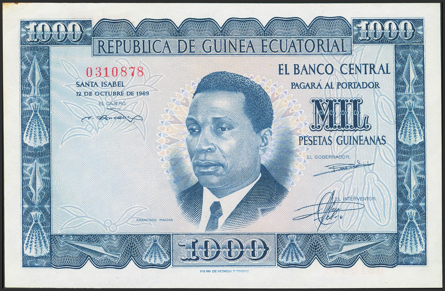 GUINEA ECUATORIAL. 1000 Pesetas. 12 de Octubre de 1969. Sin Serie. (Edifil 2023: 3). Manchita del tiempo en la esquina superior izquierda, apresto original. SC-.