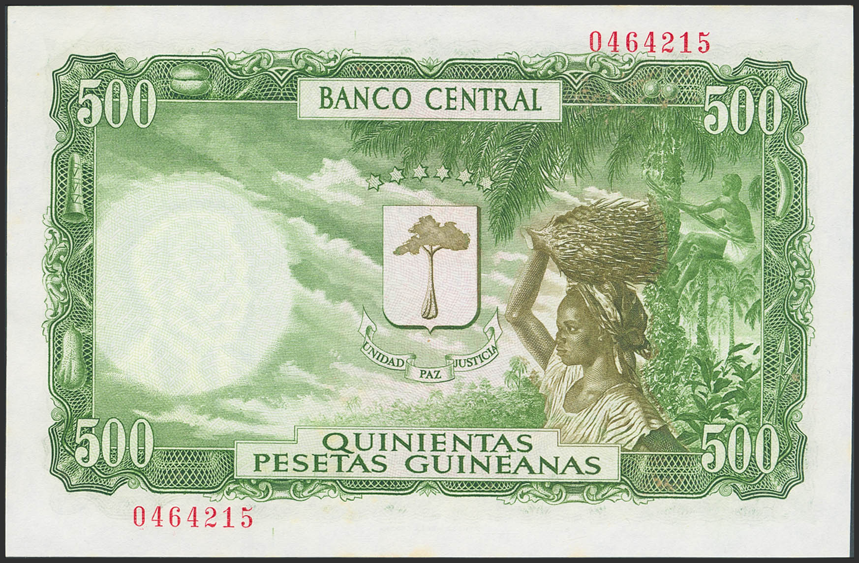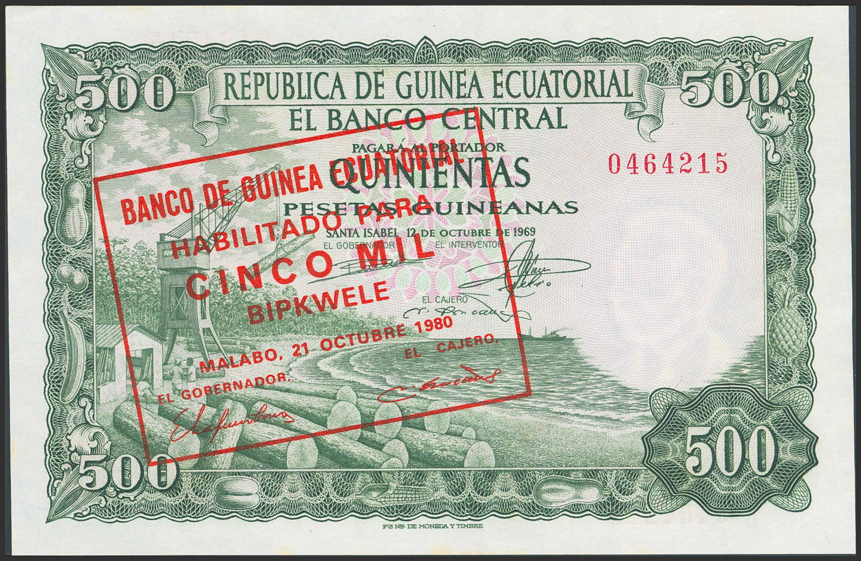 GUINEA ECUATORIAL. 5000 Bipkele sobre 500 Pesetas Guineanas. 19 de Diciembre de 1980. Sin serie y sobrecarga en el anverso en rojo. (Edifil 2023: Reseñado en página 247, Pick: 19). Apresto original. SC.