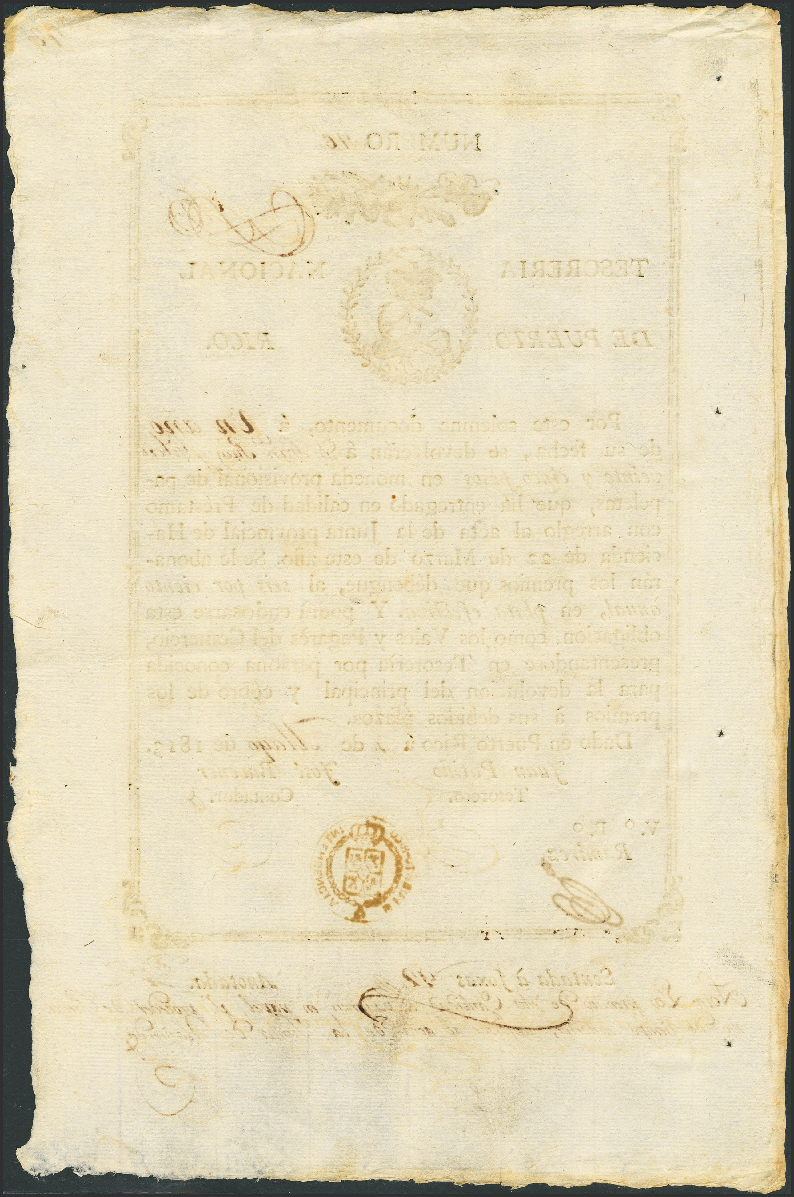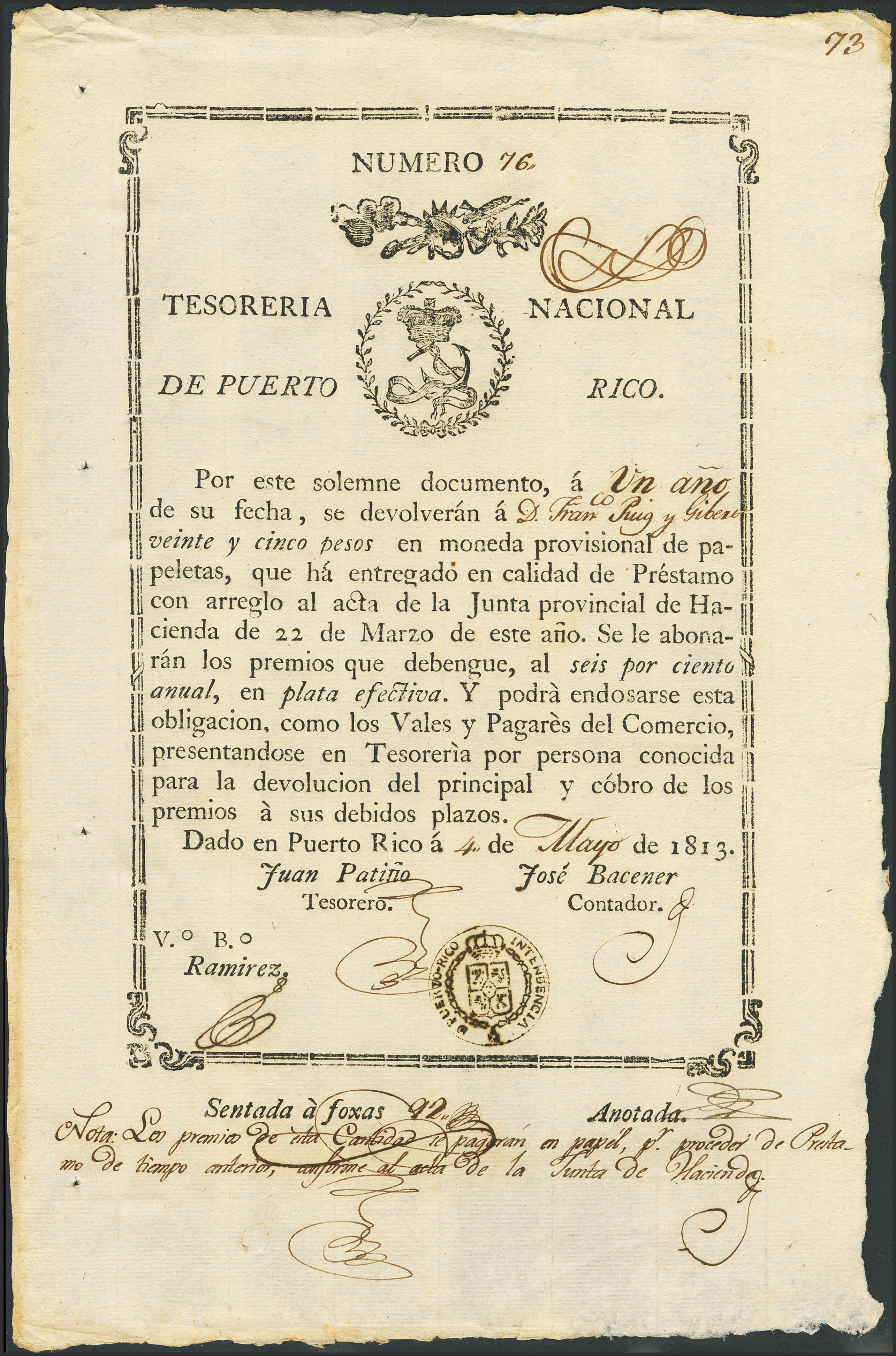 PUERTO RICO. 25 Pesos. 4 de Mayo de 1813. Sin serie. (Edifil 2023: 4). Muy raro, apresto original. SC--.
